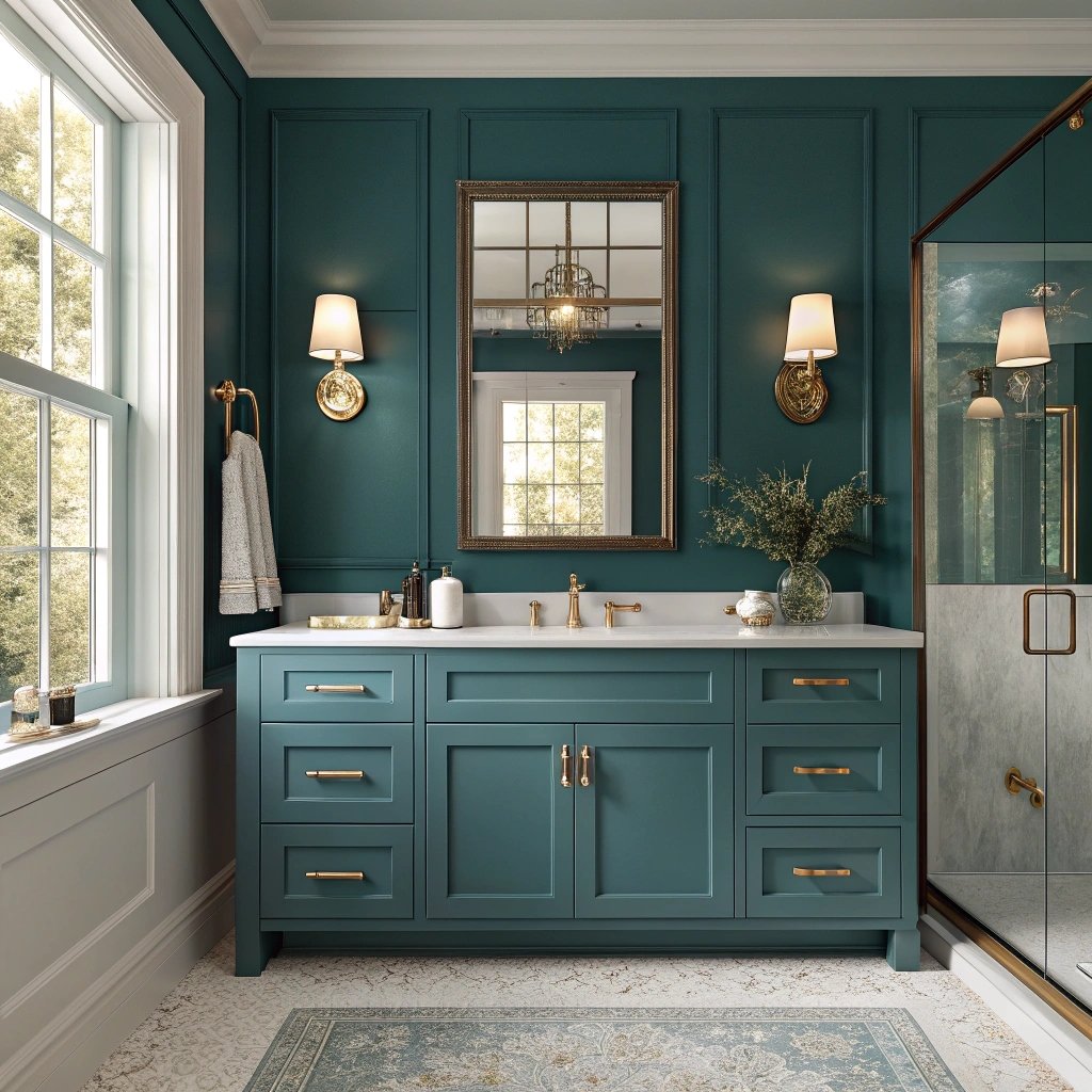 Drench the vanity wall in a saturated hue—deep teal, olive, or oxblood—and carry the color onto the cabinet fronts and mirror frame.