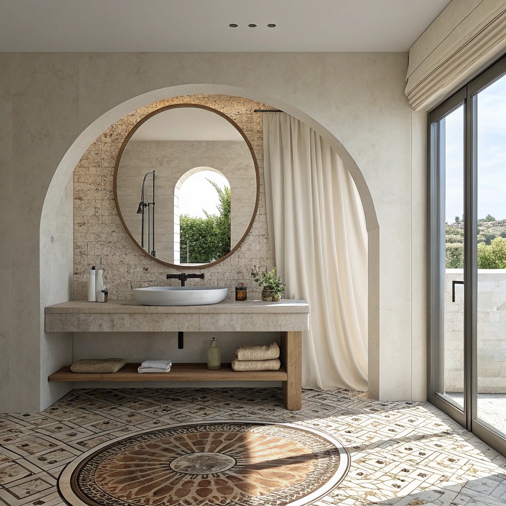 A radial-pattern rug or fan mosaic on the floor reinforces the shape language without shouting. Curves flatter faces in the mirror and soften small rooms.