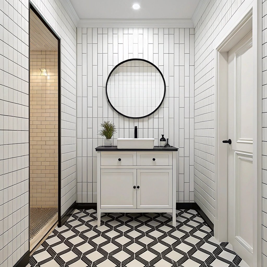 Make tile the art. Choose a bold checkerboard floor, skinny stacked subway walls, or a two-tone grout contrast to draw the eye. Keep your fixtures simple so the pattern sings.