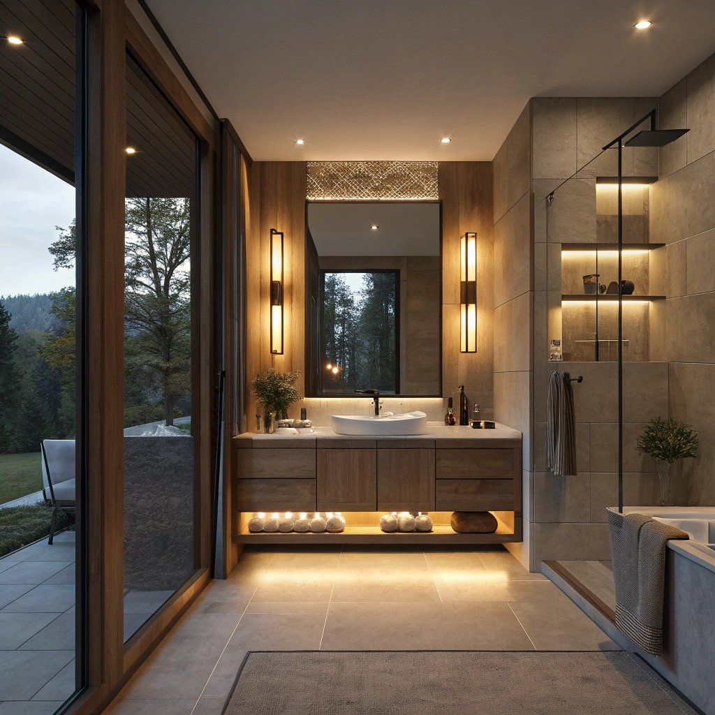 Great bathrooms glow in layers: ambient (ceiling cans), task (mirror sconces at face level), and accent (toe-kick LED, niche lighting).