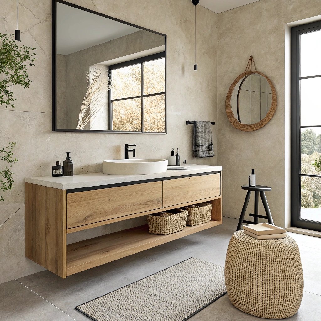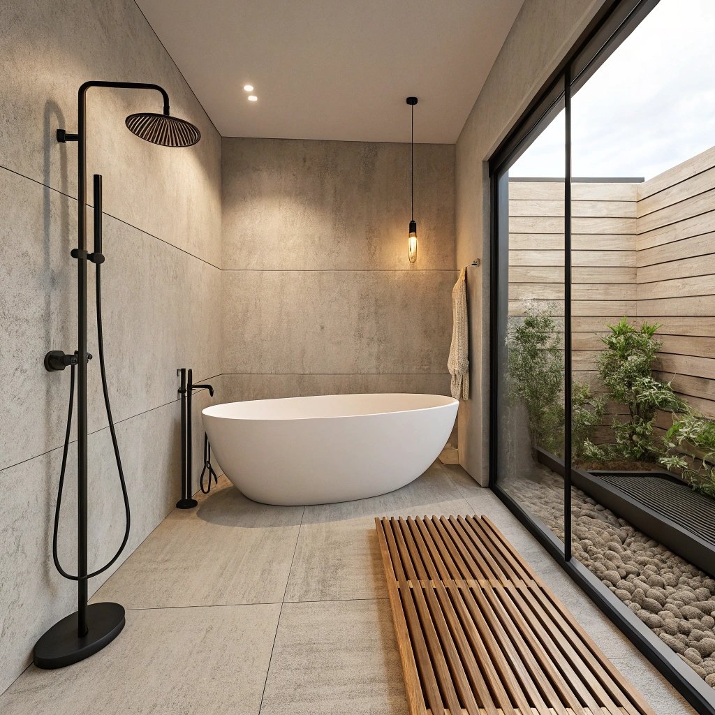 Blend Japanese restraint with Scandinavian warmth. Use pale wood accents, smooth plaster or microcement, and large-format porcelain to minimize grout lines.