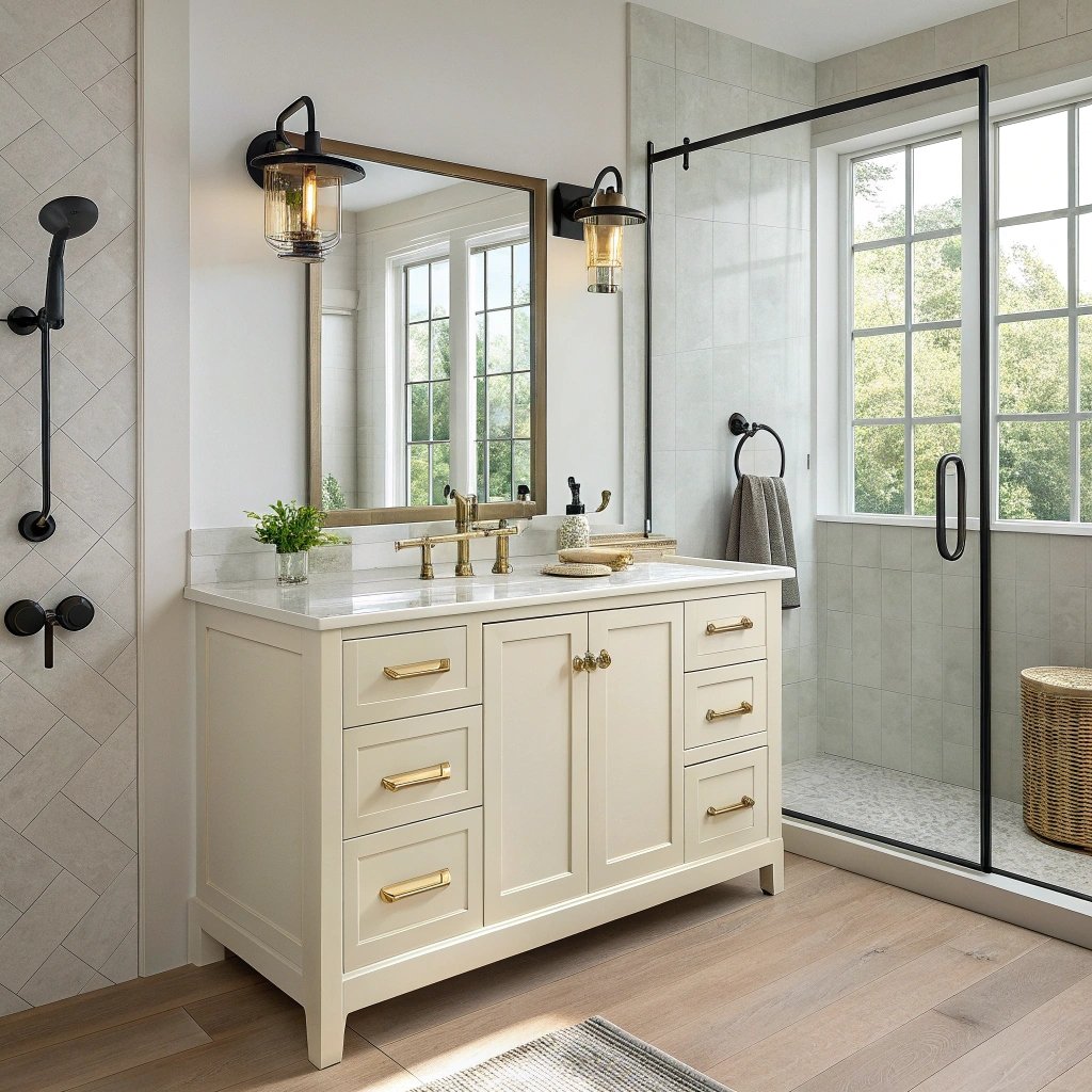 Match tone to zone. Warm brass near wood and mirrors for glow; cool nickel at the wet areas; black to anchor frames and fixtures.