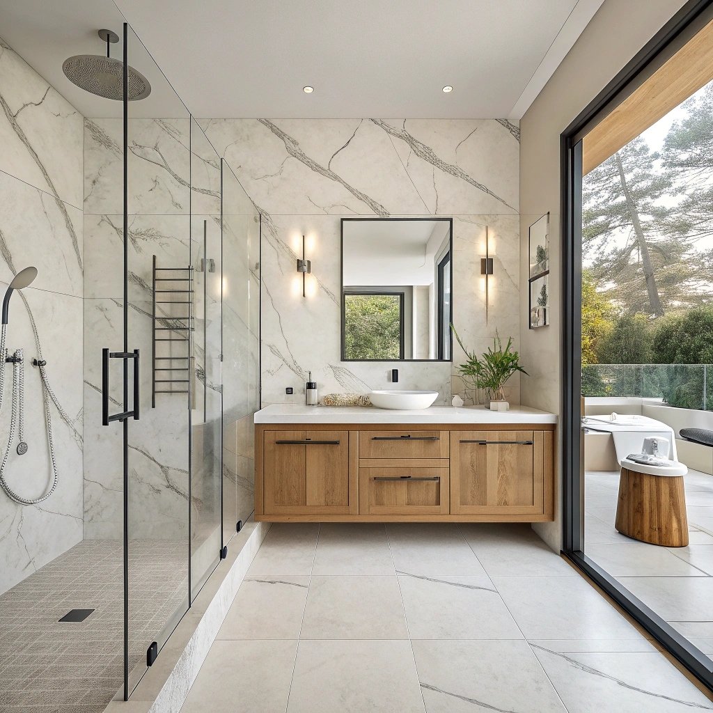 Keep everything else quiet—putty or oak vanity, frameless glass, simple linear fixtures—so the stone’s movement leads. Choose honed or leathered finishes for a soft, spa-grade feel.