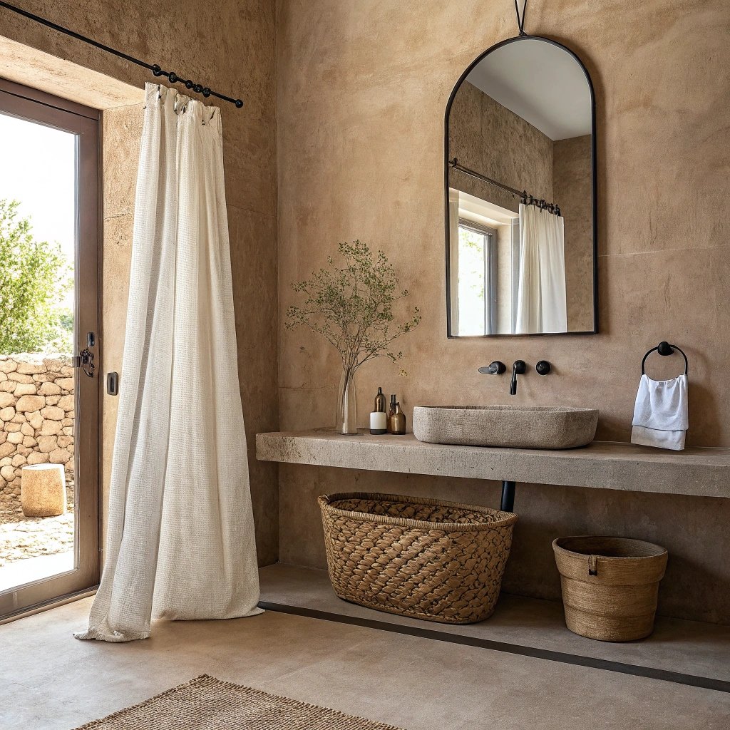 It’s all about light play. Subtle highs and lows in the finish make basic daylight feel cinematic. Go for a micro-bevel mirror (no heavy frame) and a plastered niche instead of shelves.