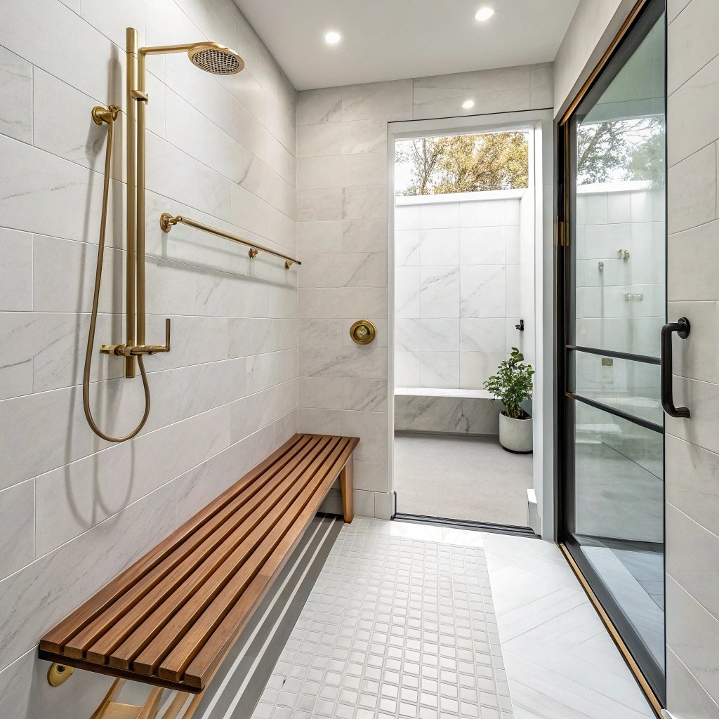 Design the supports as jewelry: powder-coated or brass bars aligned with tile lines, a teak bench that looks bespoke, and anti-slip large-format tile that reads high-end.