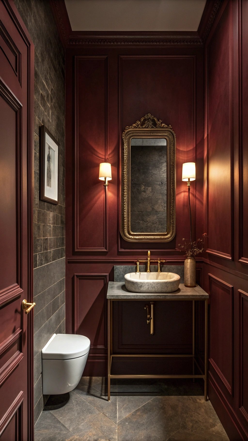 Powder rooms love bold moves. Wrap walls, ceiling, and trim in one saturated hue and keep the fixtures petite.