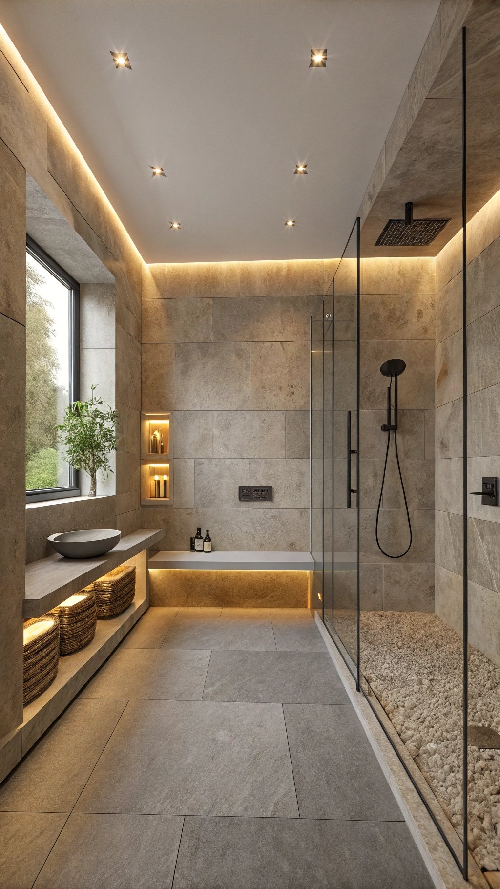 Carve storage into walls where you actually reach: shower product niches aligned to grout, a shaving niche at mirror height, and a long stone ledge over the splash zone.