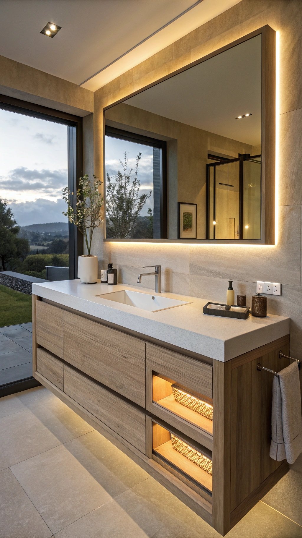 Add micro-moments that remove friction: a towel niche within arm’s reach of the shower, a landing shelf beside the tub spout, and a tray drawer for daily skincare.