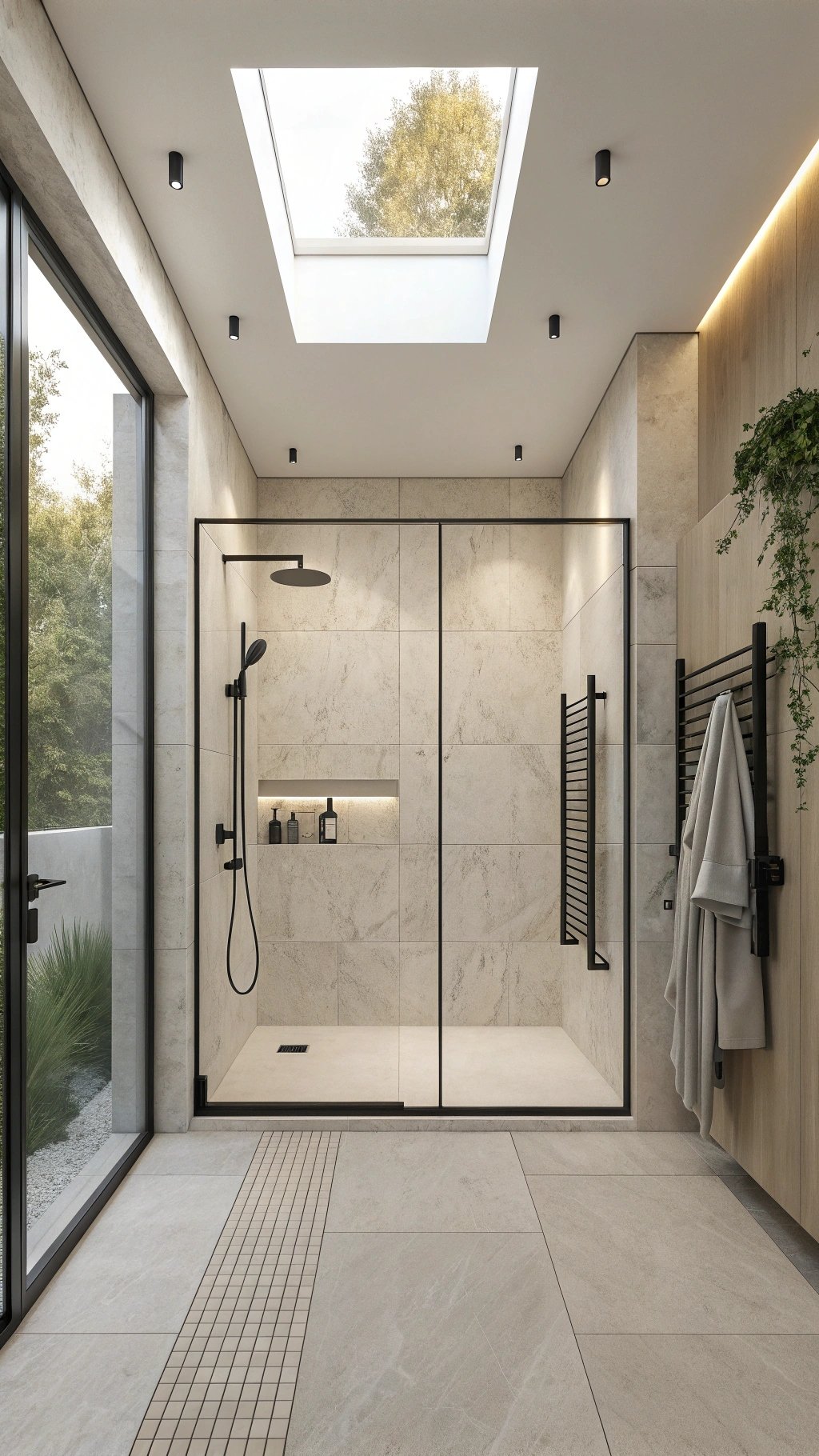 A small skylight over the shower turns steam into drama as light shafts through mist—practical by day, cinematic by night.