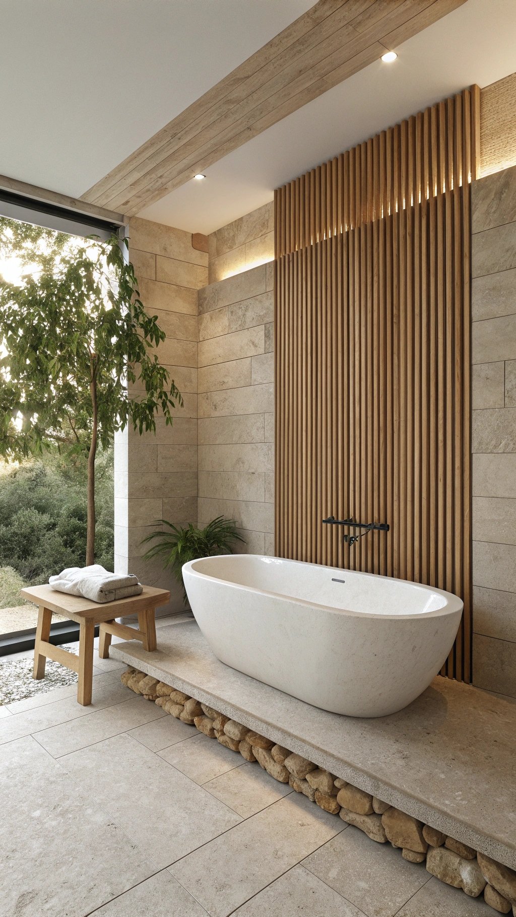 Add a cedar slat panel behind the tub for rhythm without busy pattern and a single branch in water for seasonal life.