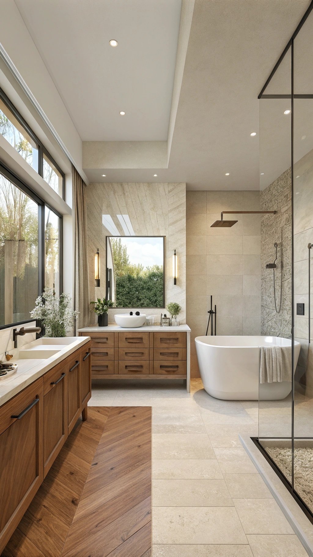 The architecture becomes the décor: fewer edges to clean, better accessibility, and a graceful hotel feel that still handles kid bath time and daily sprints.