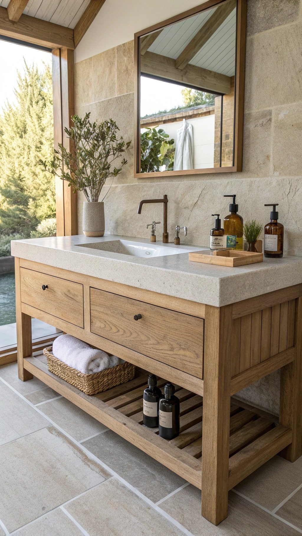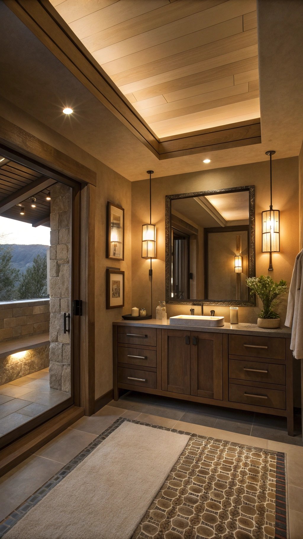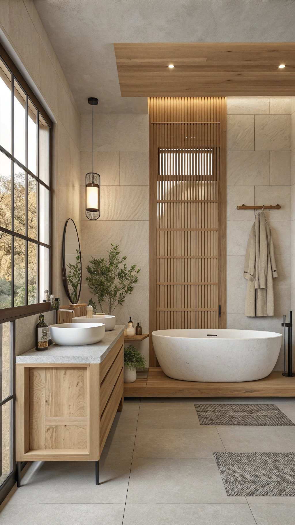 Blend pale woods, soft stones, and rounded forms. Keep the visual horizon low: a floating vanity, single shelf, and paper-lantern-style sconces.