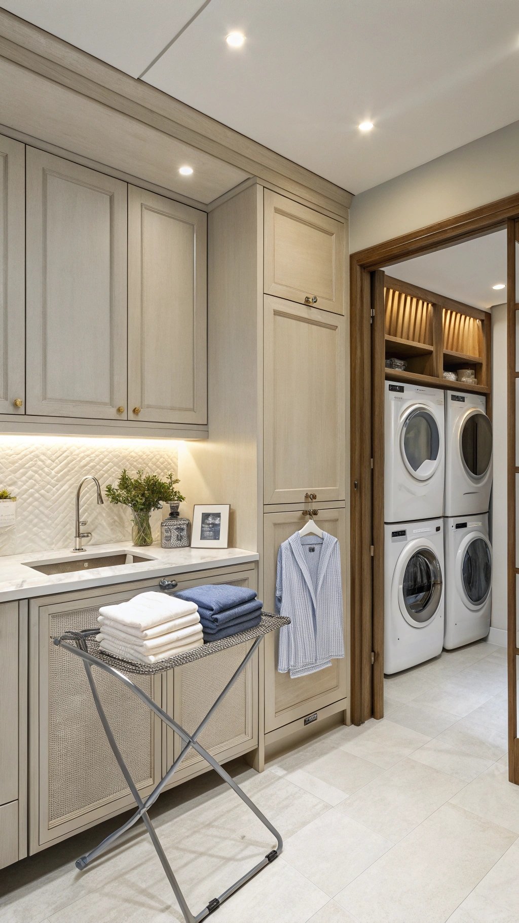 Where space is tight, stack washer/dryer behind paneled doors in the bathroom. Add a folding counter above and a pull-out rail beneath a shallow shelf for drip-dry items. Ventilation upgrades keep humidity in check and the room fresh.