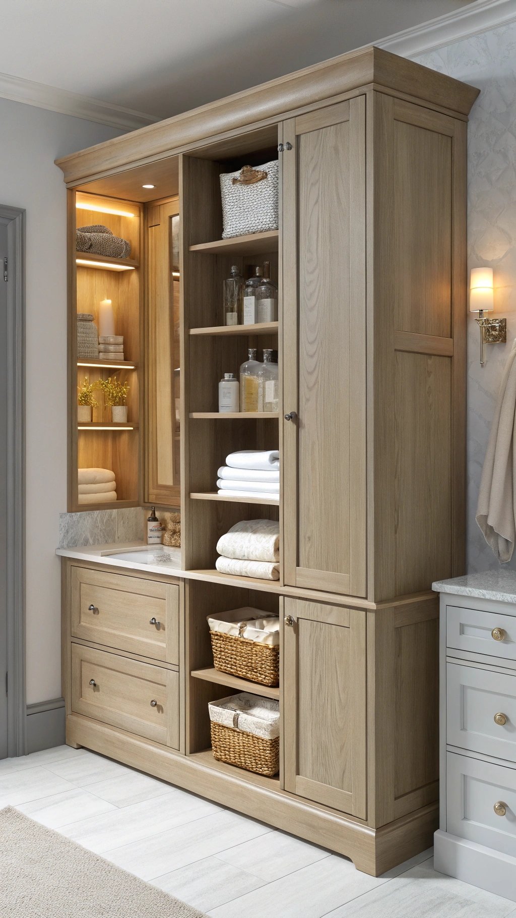 Add vertical storage as a furniture-like tower: shallow shelves up top, doors below, and tilt-out hampers at the base. Keep depth modest so it doesn’t crowd the room.