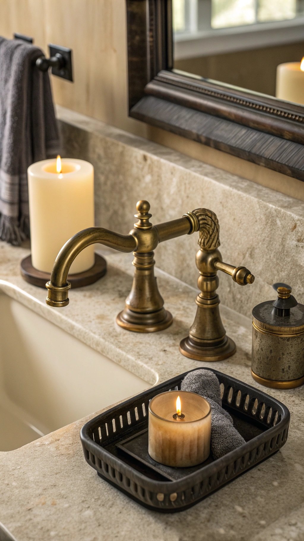 Add a small antiqued-mirror tray to bounce candlelight without introducing a new finish. Match screw heads and backplates to the selected metals to avoid visual noise.