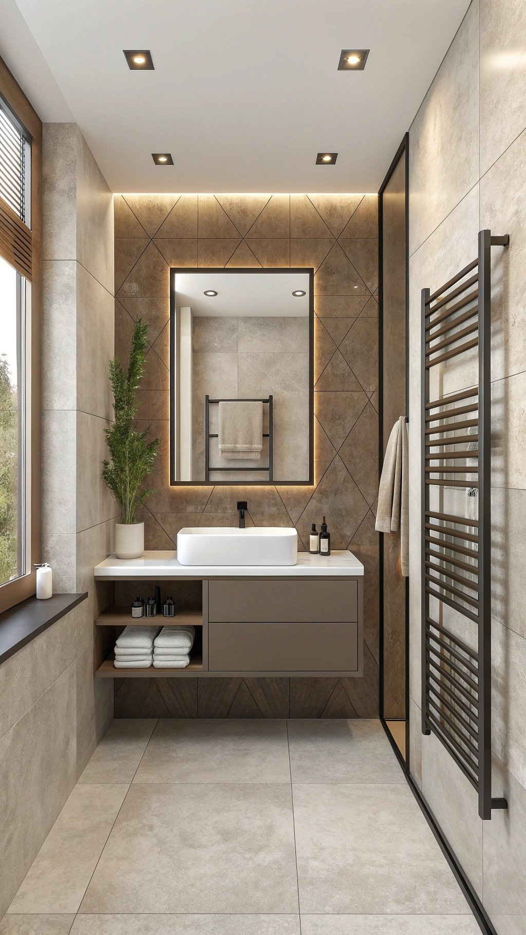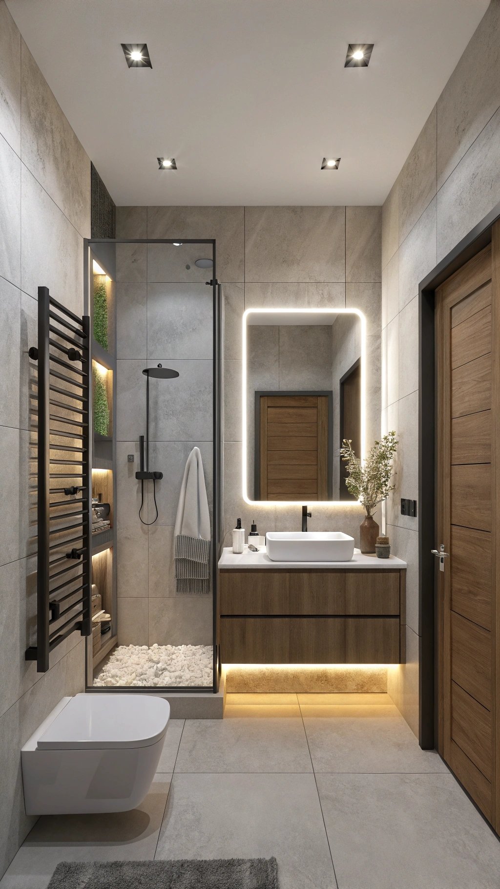 Add a wall-to-wall mirror with a slim integrated shelf lip and a bronze tint for warmth. Use a single, narrow towel warmer that doubles as a grab rail.