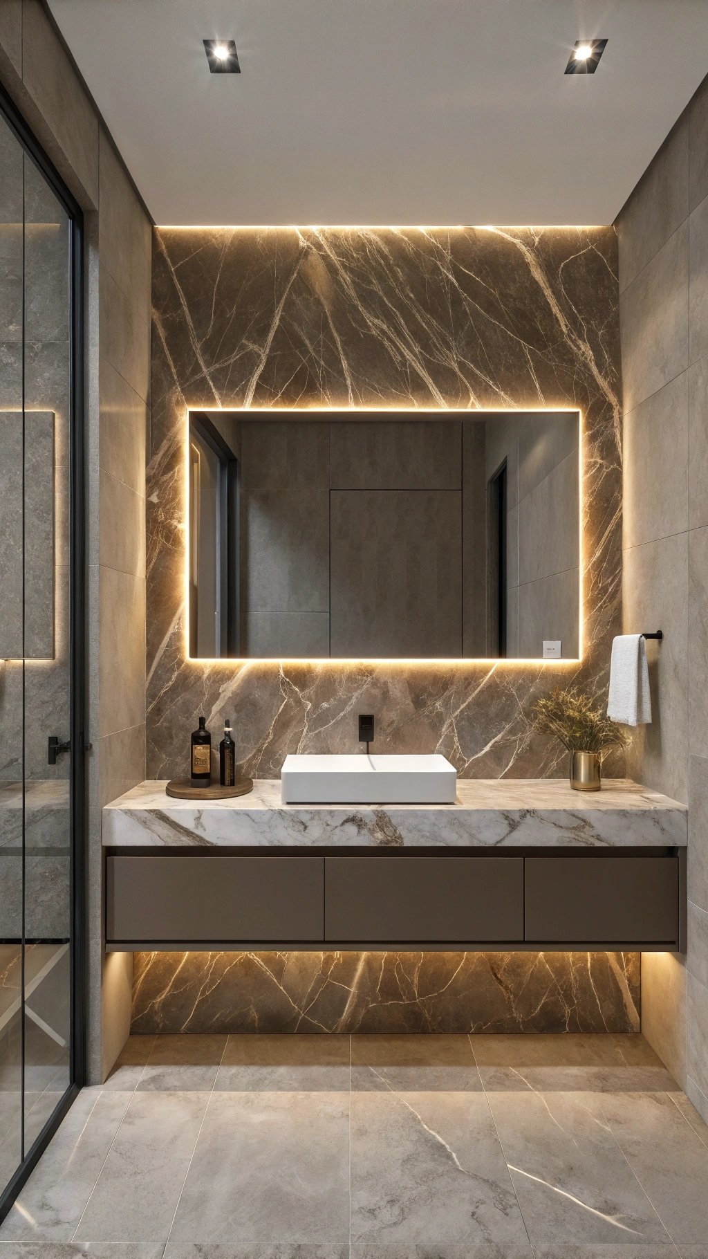 Book-match or end-match veining so the slab looks like art. Add a dimmable vertical wall grazer to pull texture from the surface at night.