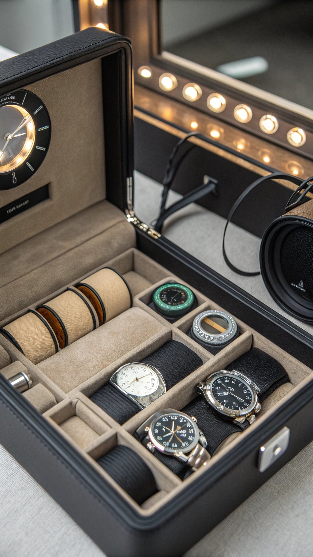 Add door-triggered micro-LEDs inside the drawers and a charging tray for wearables. Keep lens wipes and case boxes in uniform sizes for visual calm.
