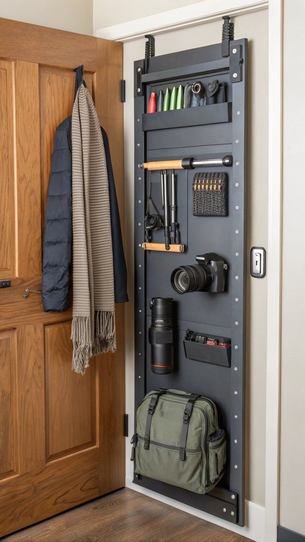Back-of-door space is prime real estate. Install shallow rails for belts and scarves, a capped hook for hats, and a pocket for lint brush and roller.
