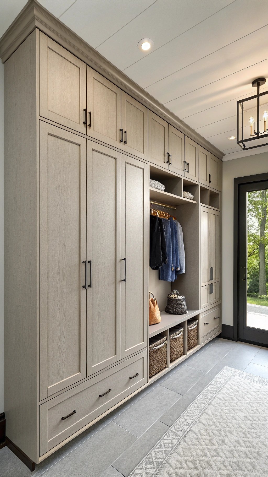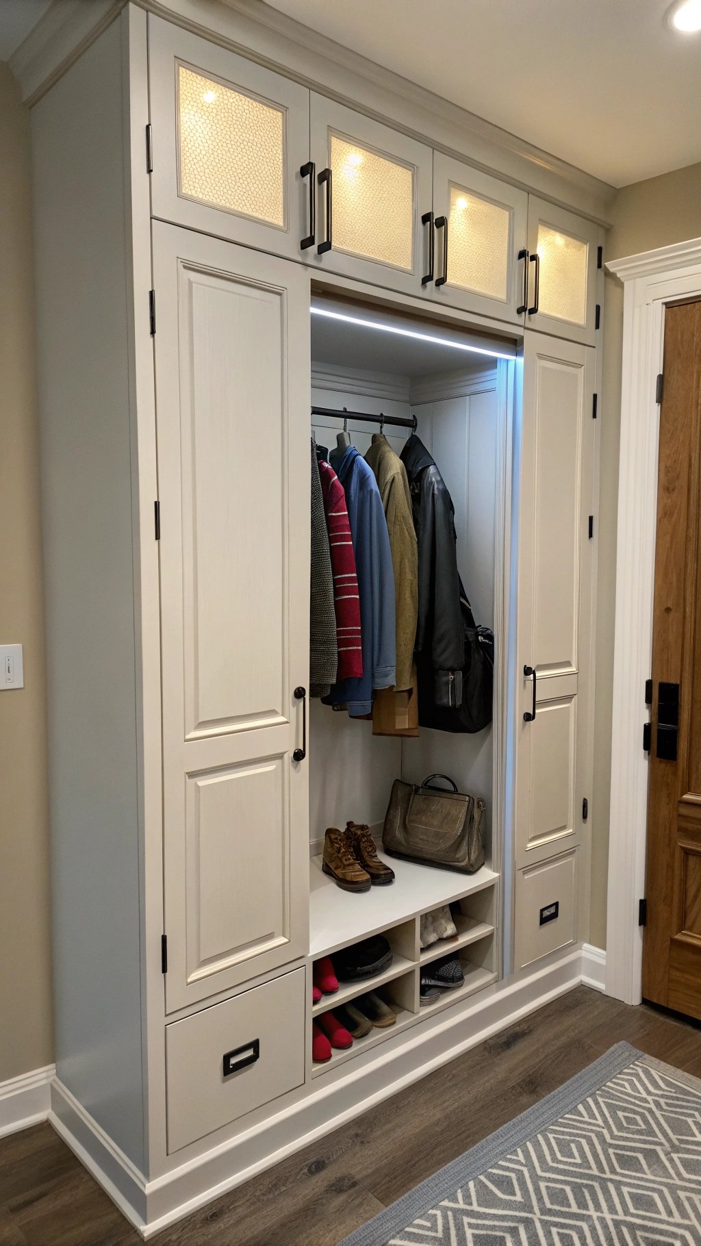 In tiny spaces, use a floor-to-ceiling locker approach: closed cubbies for visual calm, a single open niche for keys and sunglasses, and a drawer for gloves. Back-of-door hooks manage umbrellas and totes.