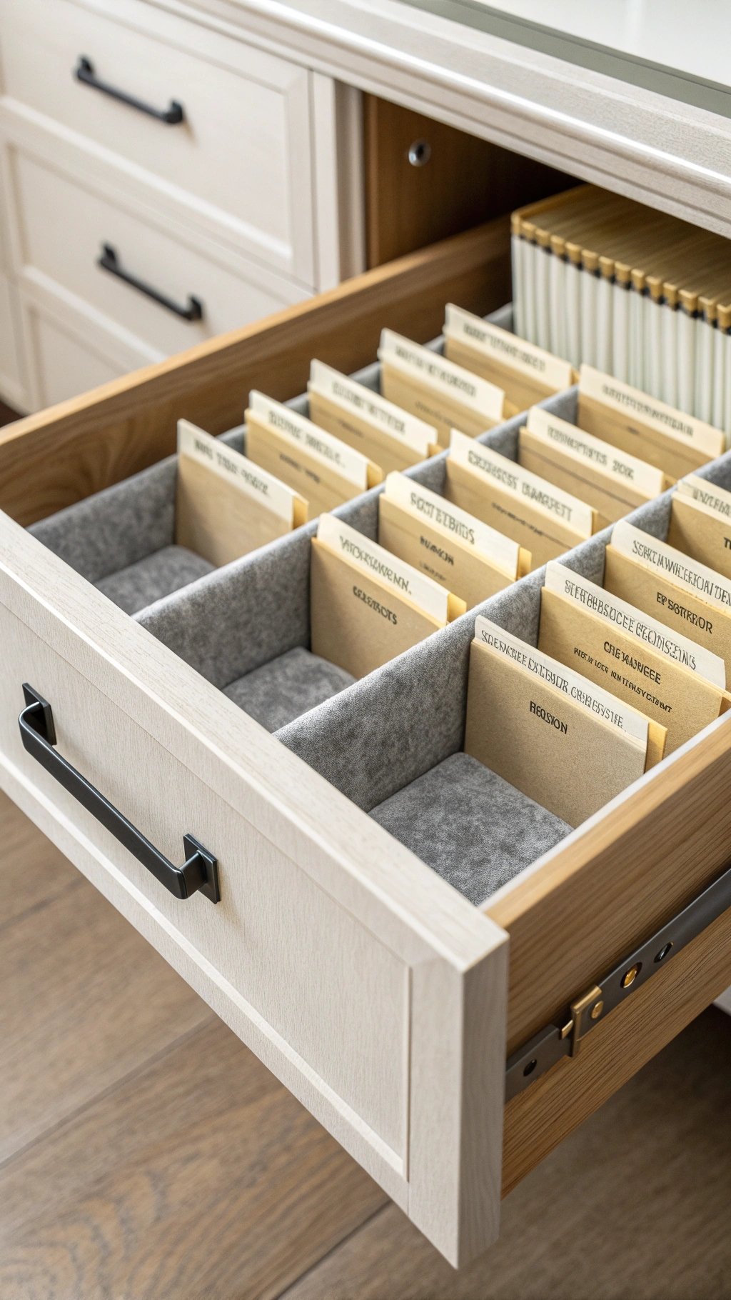 Color-match felt or linen liners to cabinet interiors for a custom look, then laser-label the drawer lips discreetly.
