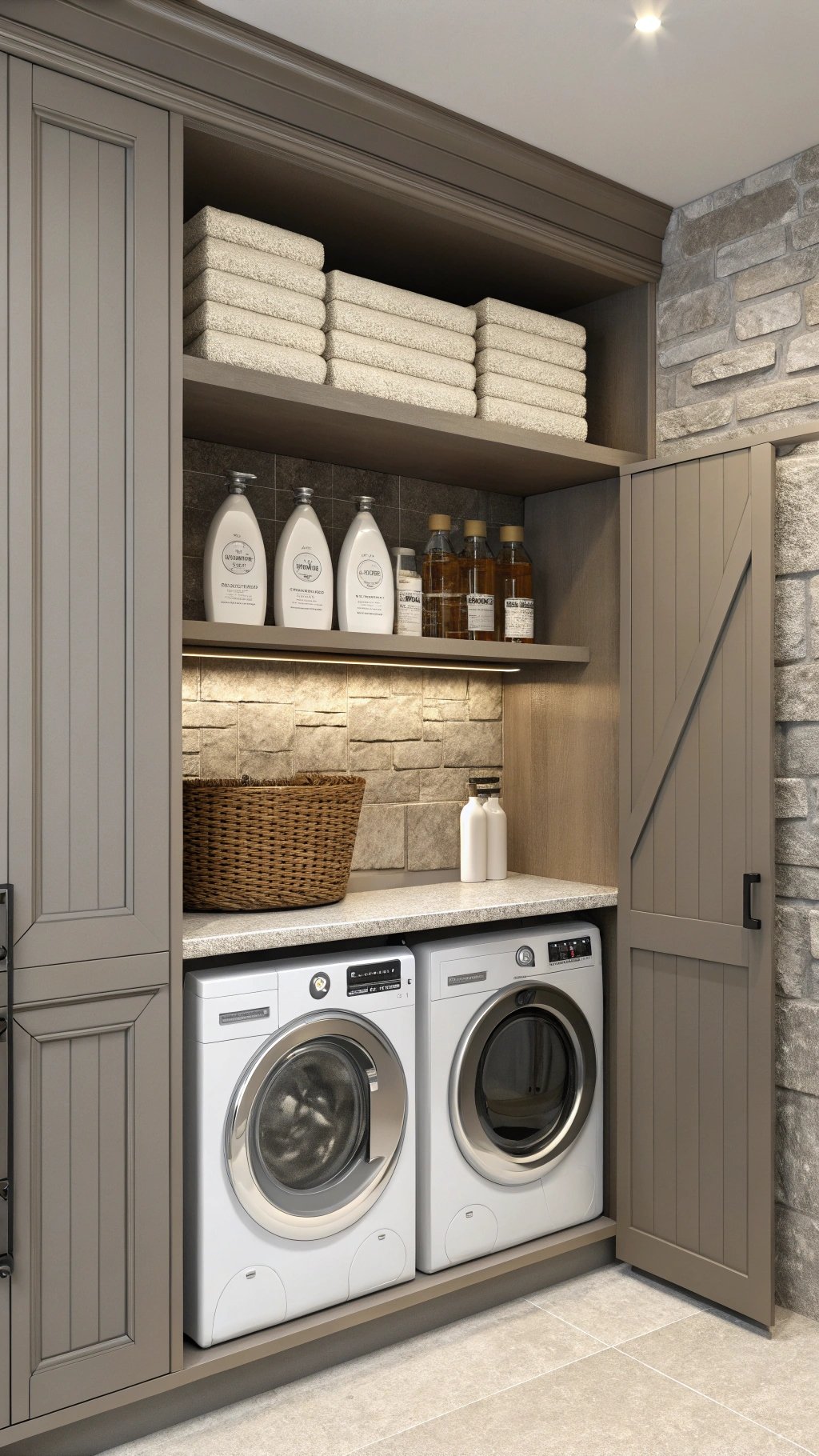 If space allows, a paneled washer/dryer stack sits behind quiet doors with a folding counter above.