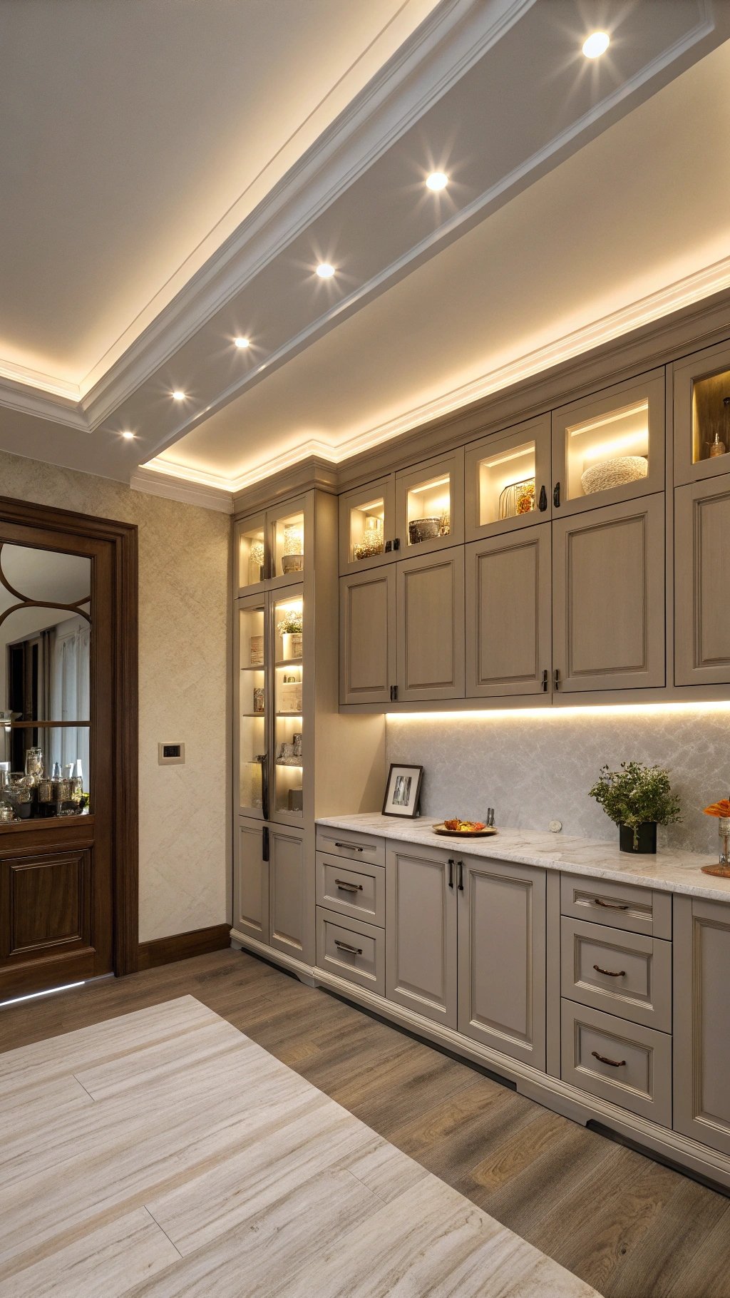 Aim for 90+ CRI at 2700–3000K so colors read true. Combine ambient (flush ceiling), task (under-shelf strips), and accent (interior cabinet LEDs).