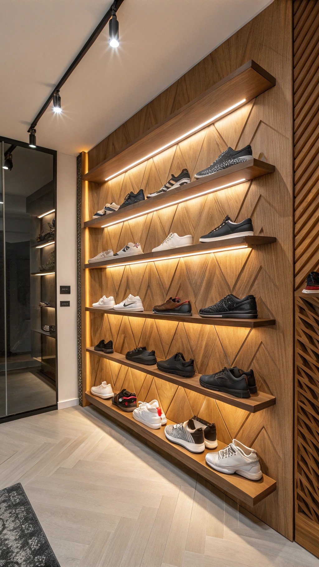 Run a slim LED spine down the center to graze toes lightly—museum vibes without glare. Include a hidden pull-out perch for quick try-ons, then slide it away.