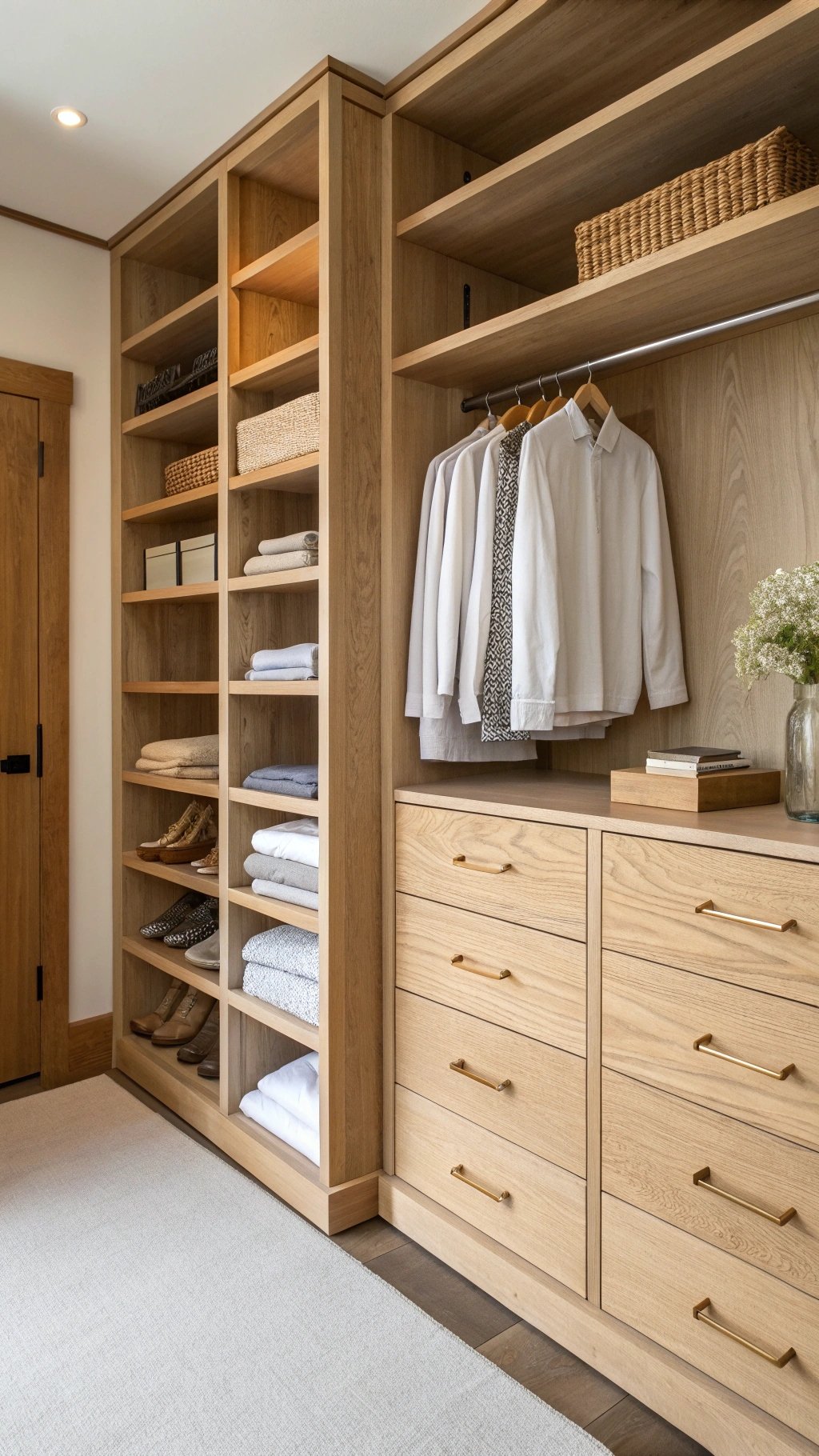 Use shallow, full-extension drawers for tees, knits, and intimates. Fit them with modular inserts—file-fold channels for tees, soft bins for socks, felt-lined cells for delicates—so each fold has a home.