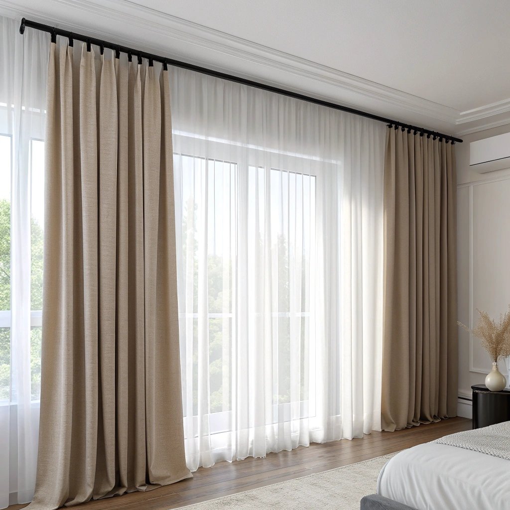 Control is comfort. The double layer adapts to seasons and routines without sacrificing style. High-and-wide installation elongates the wall, making the room feel taller and more polished.