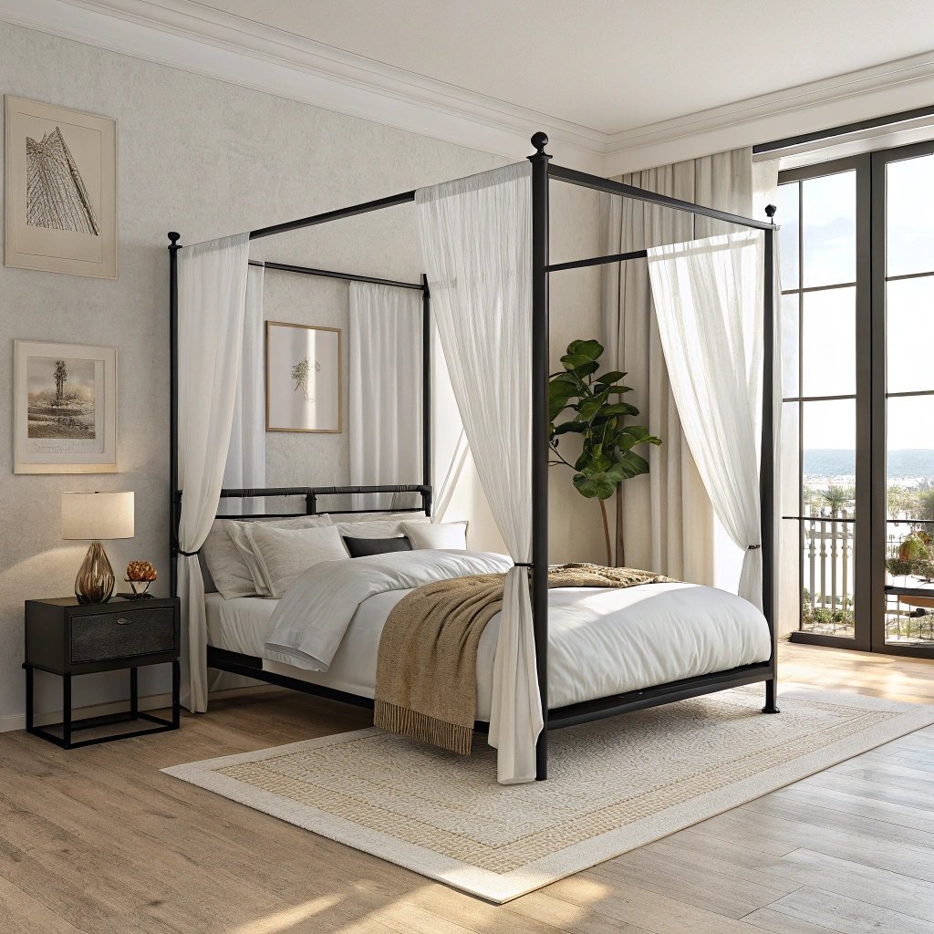 Sheers sway slightly with airflow, adding gentle movement that calms the eye. Because the canopy draws the gaze up, ceilings feel taller and proportions more elegant—cozy and architectural at once.