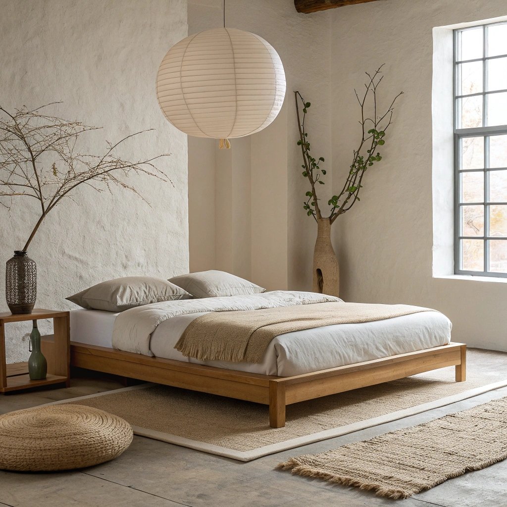 Blend Scandinavian warmth with Japanese simplicity: low platform bed, light wood, soft edges, and restrained decor.