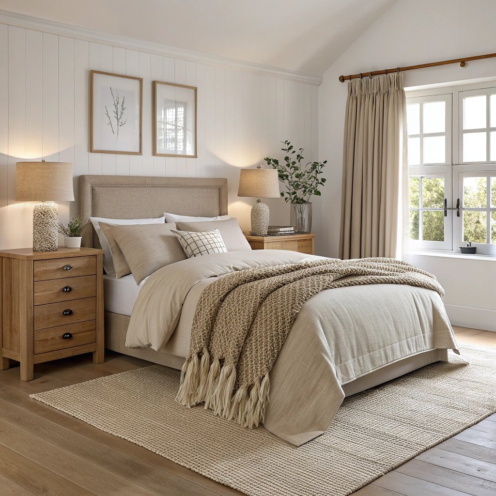 Think warmth without visual noise. Start with a neutral base—warm white walls, taupe linen duvet, oatmeal throw—then stack textures: chunky knit blankets, bouclé pillows, a nubby wool rug, and raw-edge linen curtains.