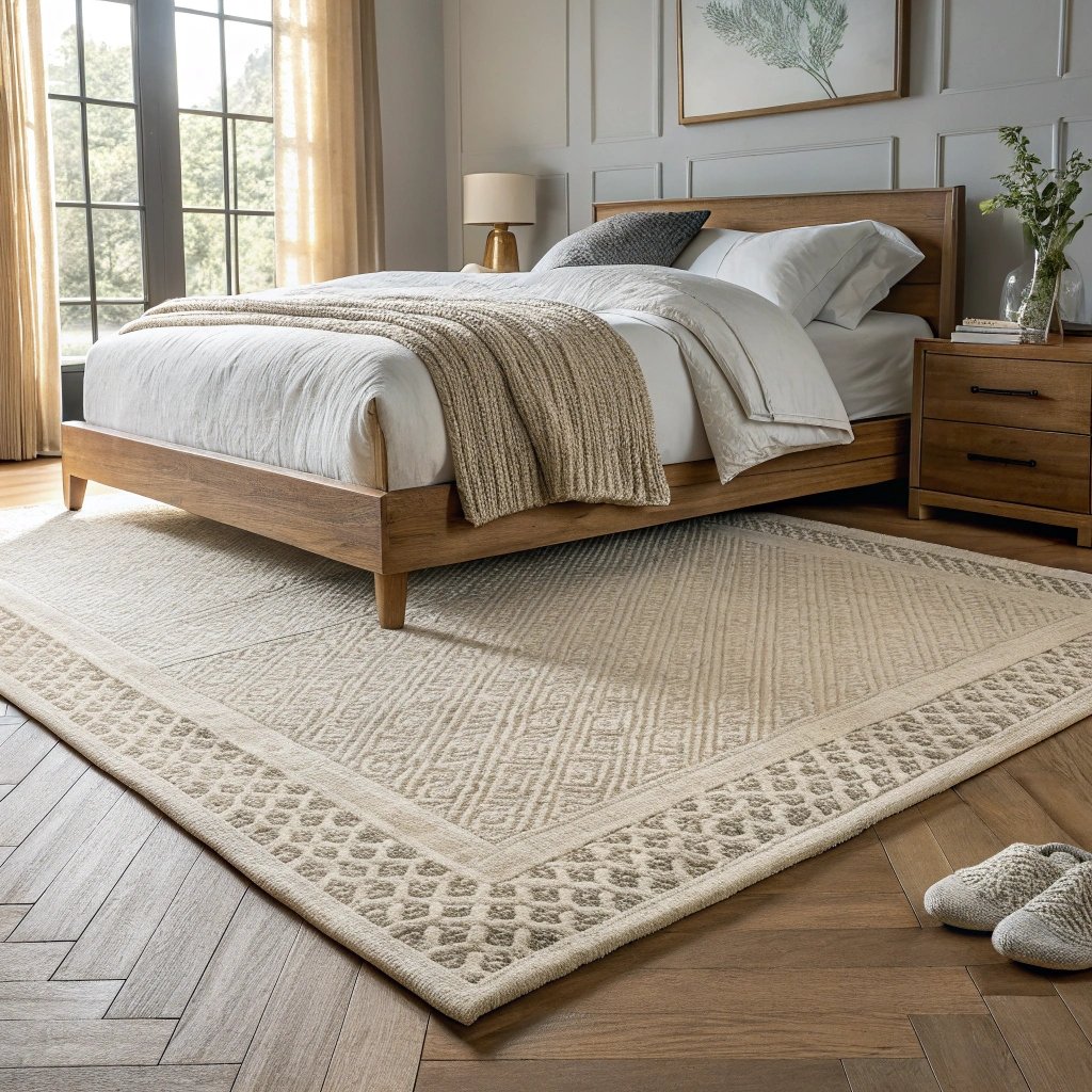 The layer trick zones the bed area and makes the room feel custom. It’s also practical: swap the top rug seasonally for a refresh.