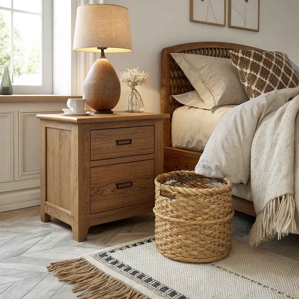 Bring in tactile, breathable materials: oak nightstands, linen bedding, wool rug, clay lamp base, woven rattan hamper.