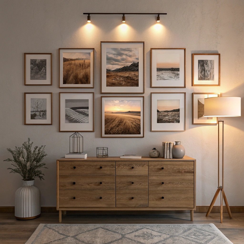 The trick is restraint: edit to a tight color story and frame style so it looks intentional. Dim a picture light at night for a soft glow that doubles as ambient lighting.