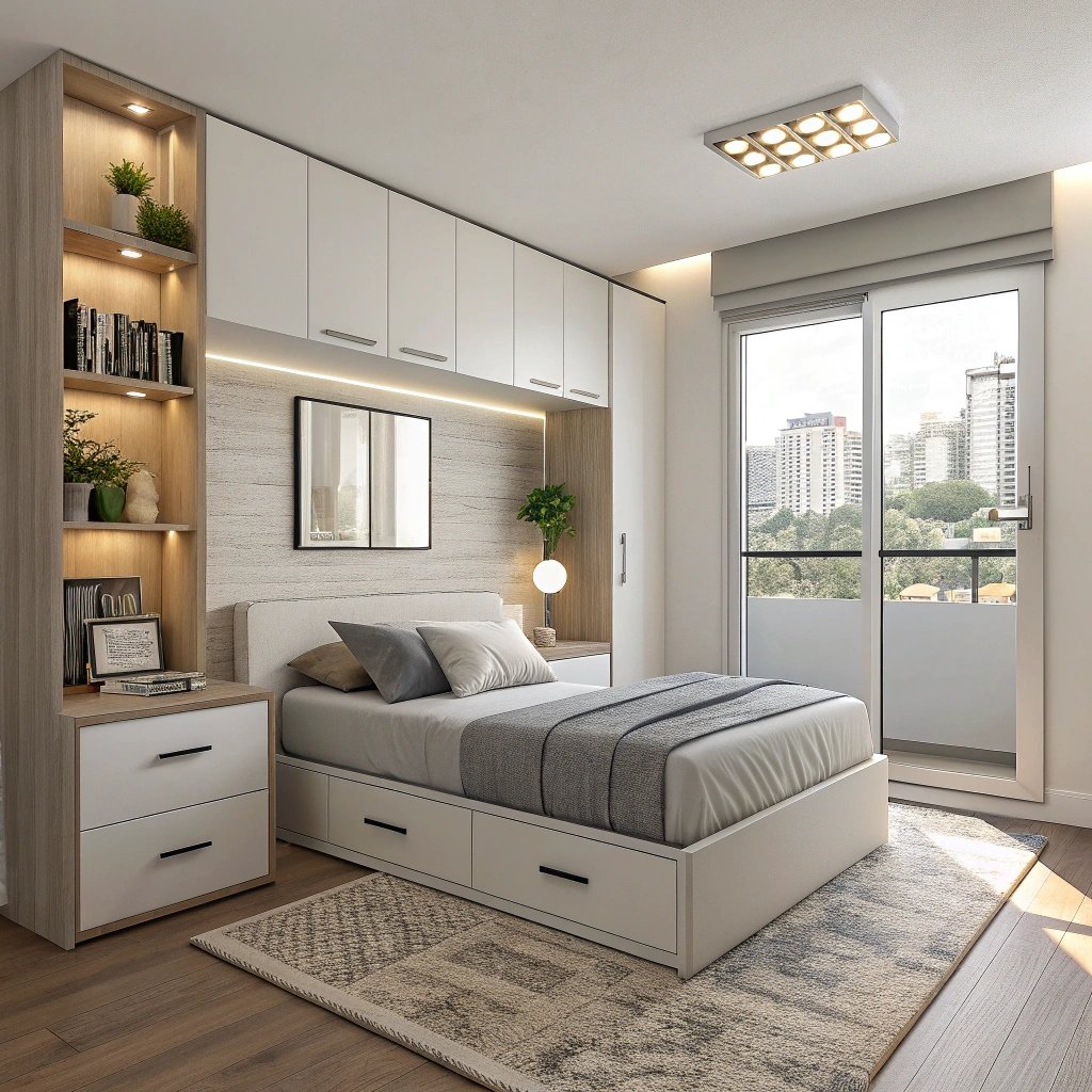 Drawer beds eliminate bulky dressers, and shallow shelves hold bedtime essentials without elbow bumps. The room reads calm, not cramped—proof that cozy isn’t about size.