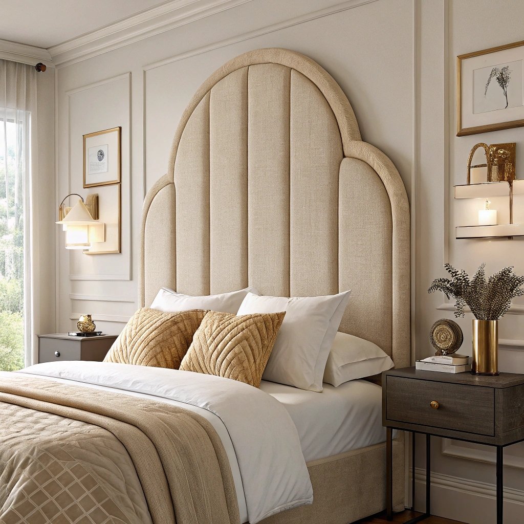 A tall, softly padded headboard delivers comfort and presence. Choose channel tufting, arched curves, or a wingback shape in a tactile fabric like velvet, tweed, or performance linen.
