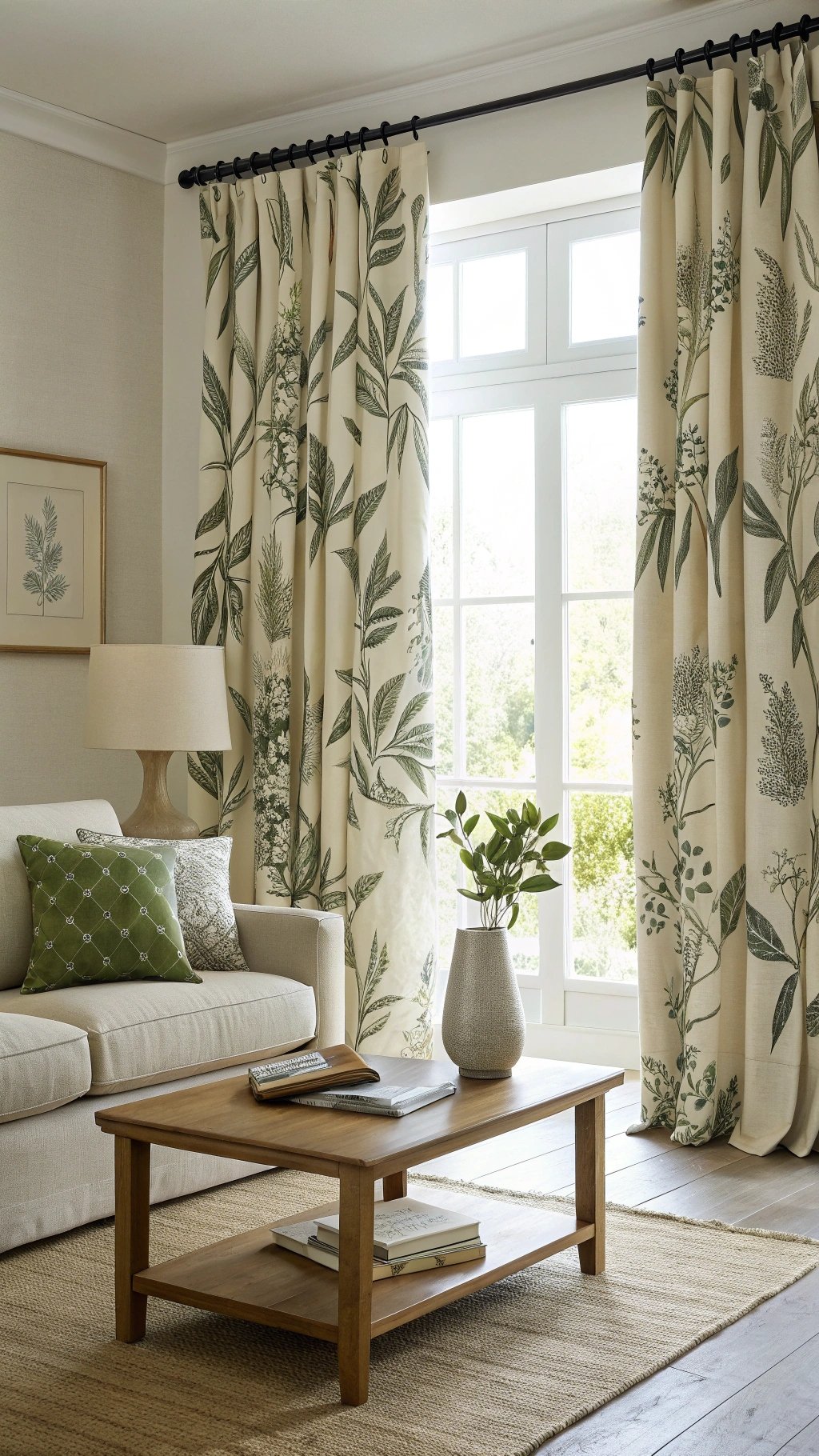 Let curtains carry the room’s personality with a large-scale print—abstract botanicals, painterly stripes, or heritage motifs.