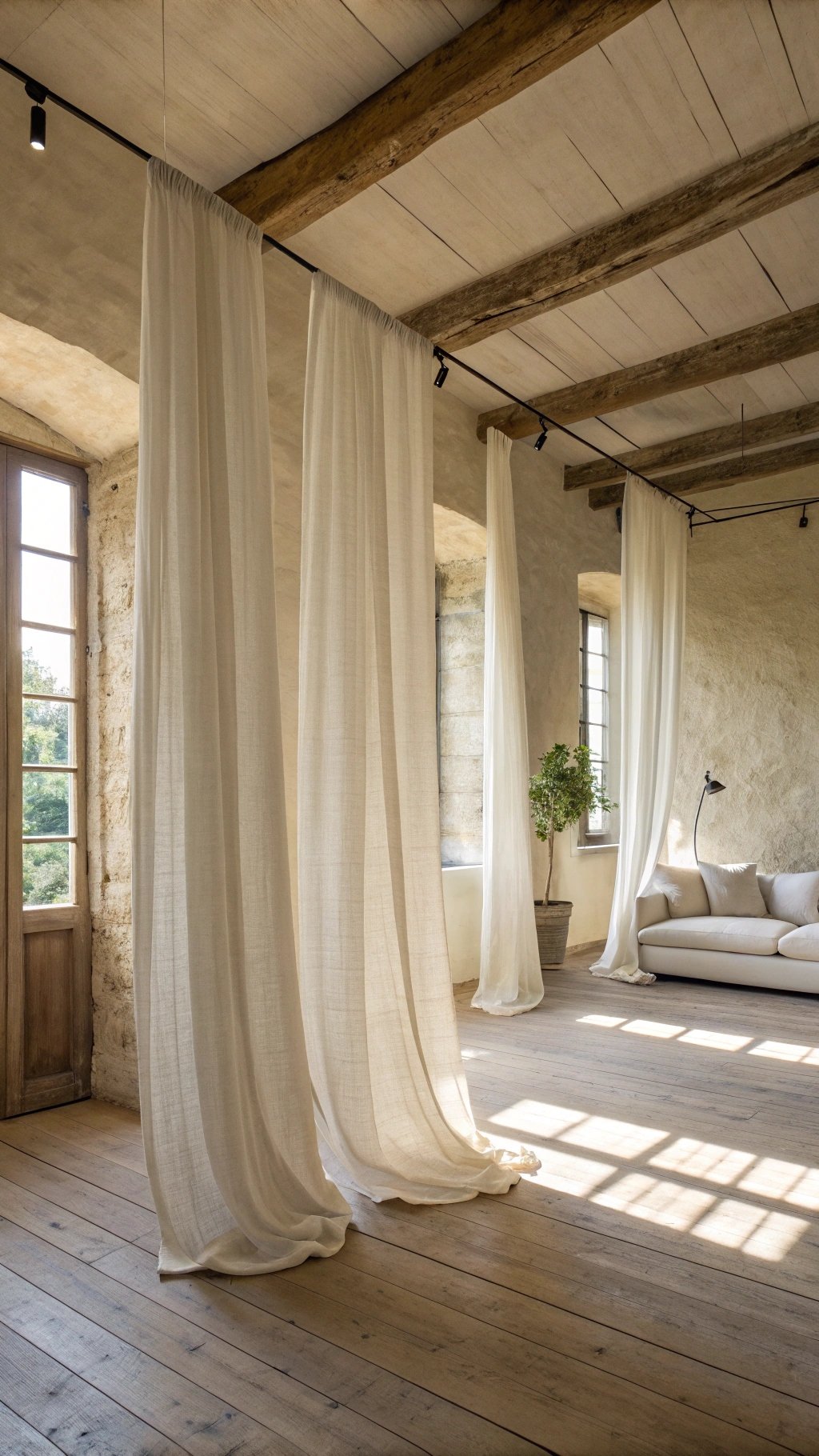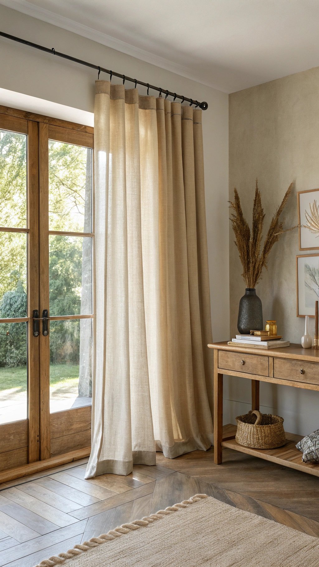 Airy linen sheers turn sunlight into texture. They blur outside views just enough for daytime privacy while keeping the room bright.