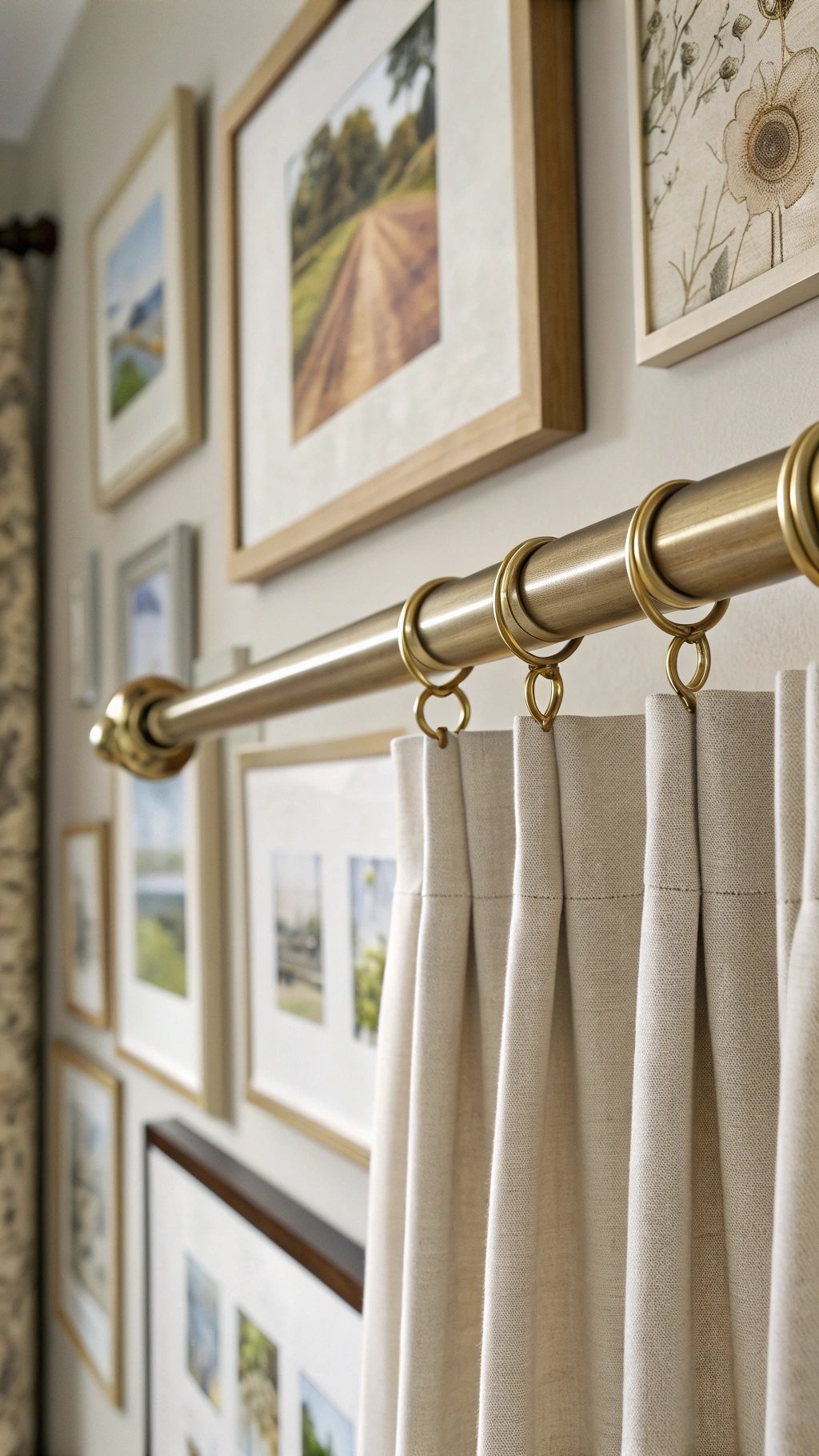 Alternatively, a slender brass or blackened-steel rod with minimal finials adds a line of elegance. Rings with quiet glides make daily use feel premium.