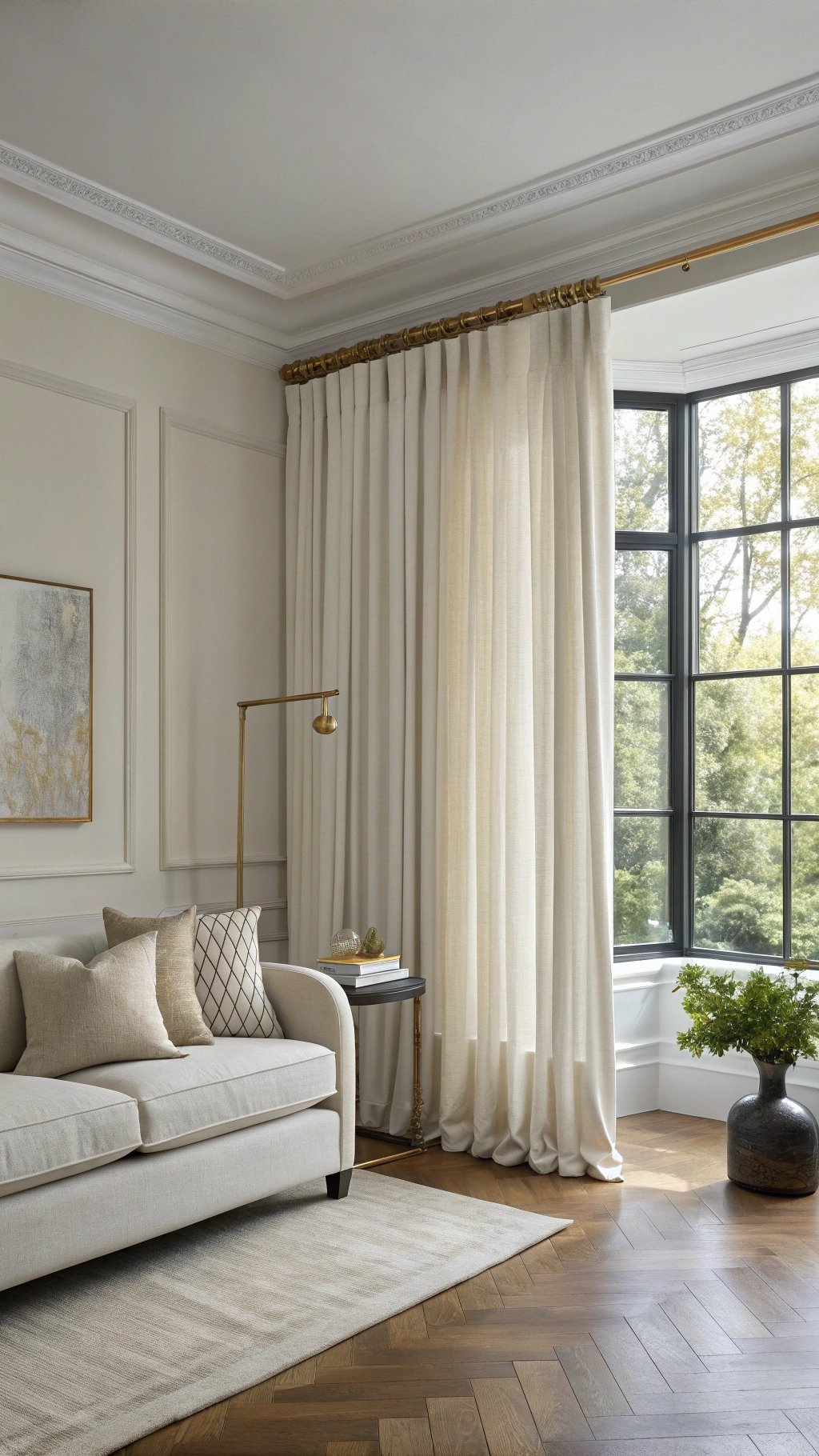 Running curtains from ceiling to floor—and ideally wall-to-wall—visually widens the room and raises the perceived ceiling.
