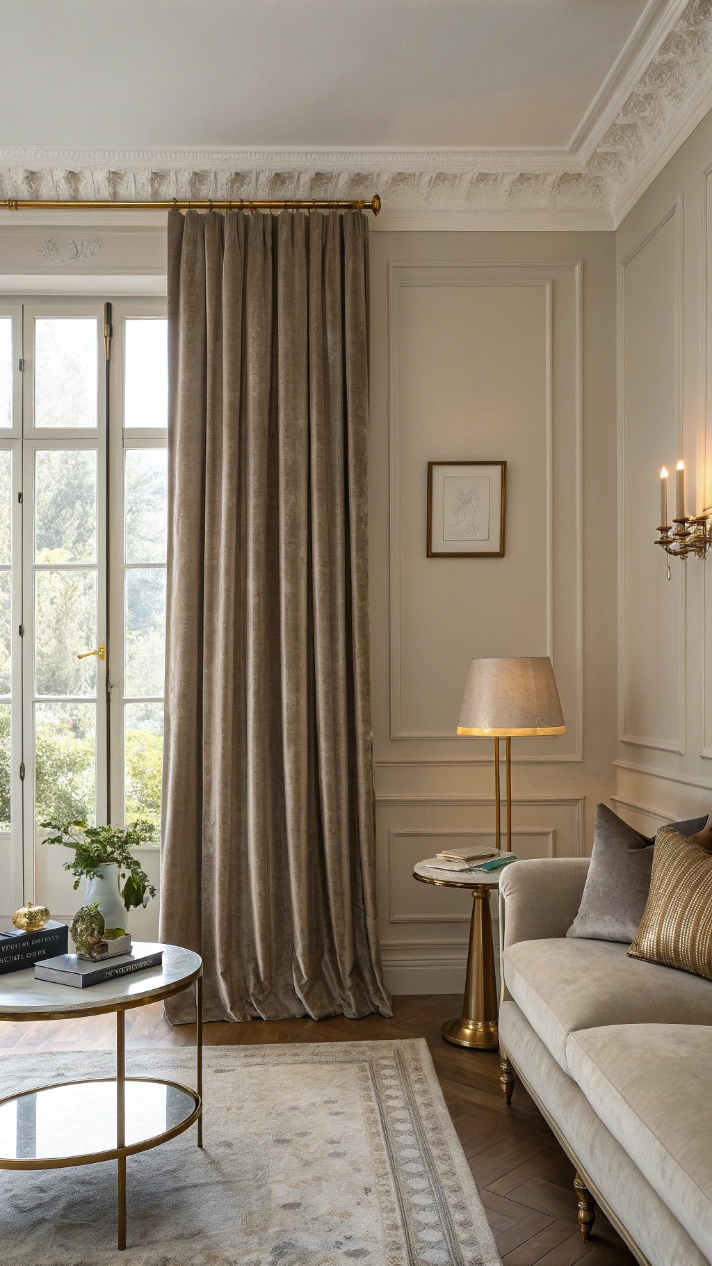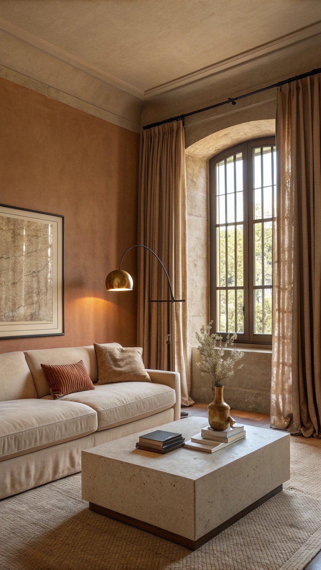 Play with sheen: matte walls, soft-lustre curtains, and a velvety cushion. Add one pale stone element (travertine table) to keep the palette lifted, and a single brass detail for glow. The tonal discipline reads luxurious without relying on pattern or loud color.