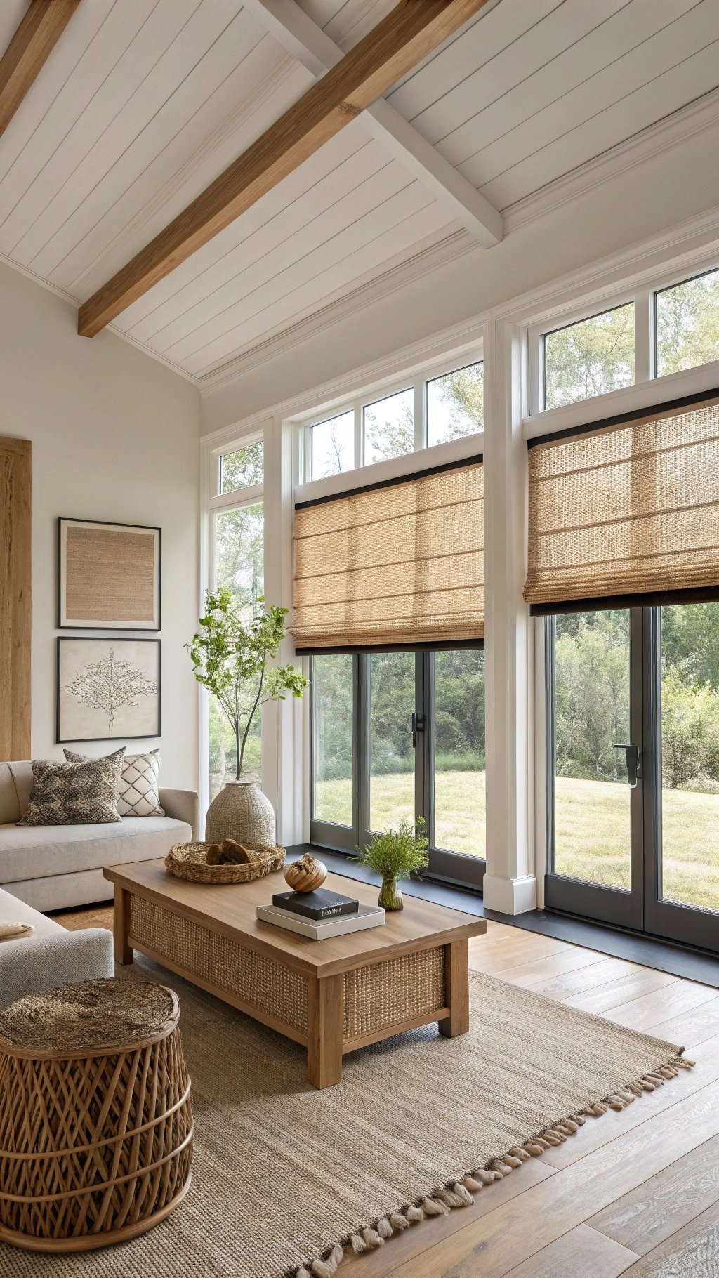 Layer natural shades—bamboo, grasscloth, or woven wood—with soft side panels. The shades handle glare and texture; the panels add height and refinement.