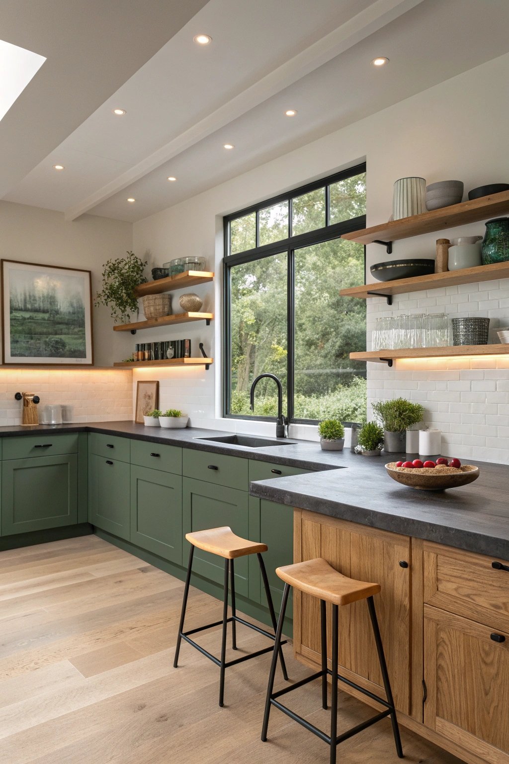 A rich forest tone grounds the lower cabinets while natural oak warms uppers, shelves, and stool legs. The combo feels organic and balanced, like a walk in the woods.