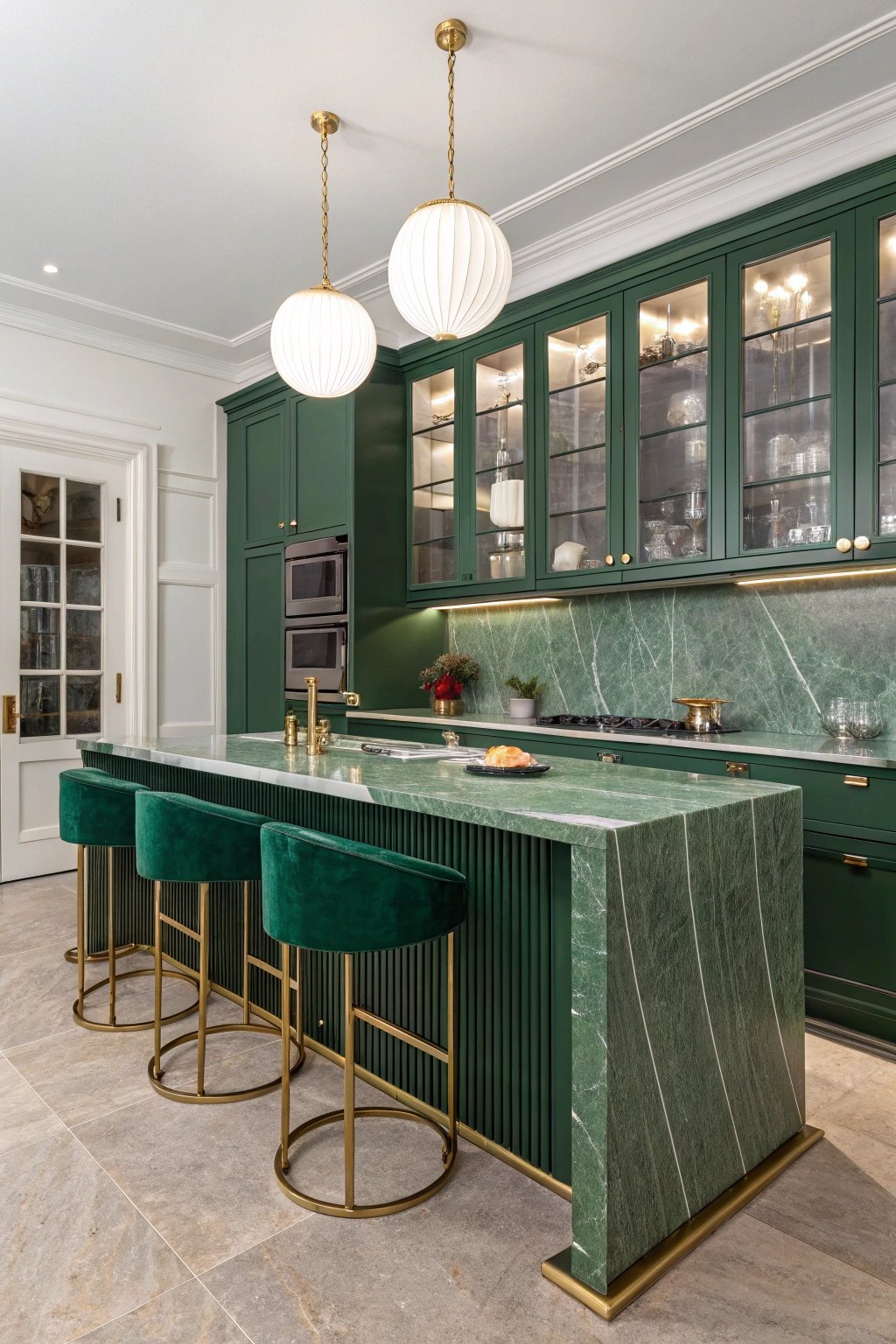 Tall glass-front cabinets display barware, and a brass pot filler frames the range. Velvet bar stools and ribbed globe pendants introduce subtle hotel-lobby energy.