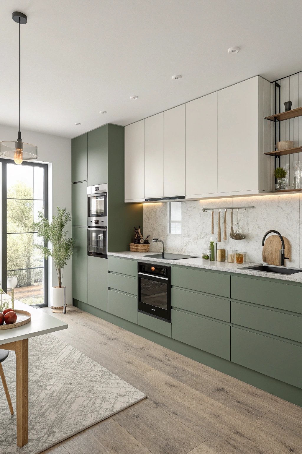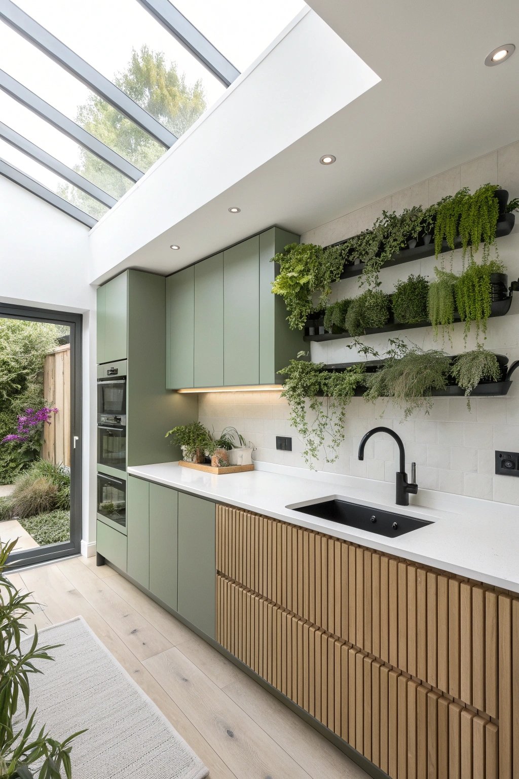 Lean into “green” literally with a living herb wall near the prep zone. Choose a mid-green cabinet color that harmonizes with plant tones, and keep counters in white quartz to bounce light onto foliage.