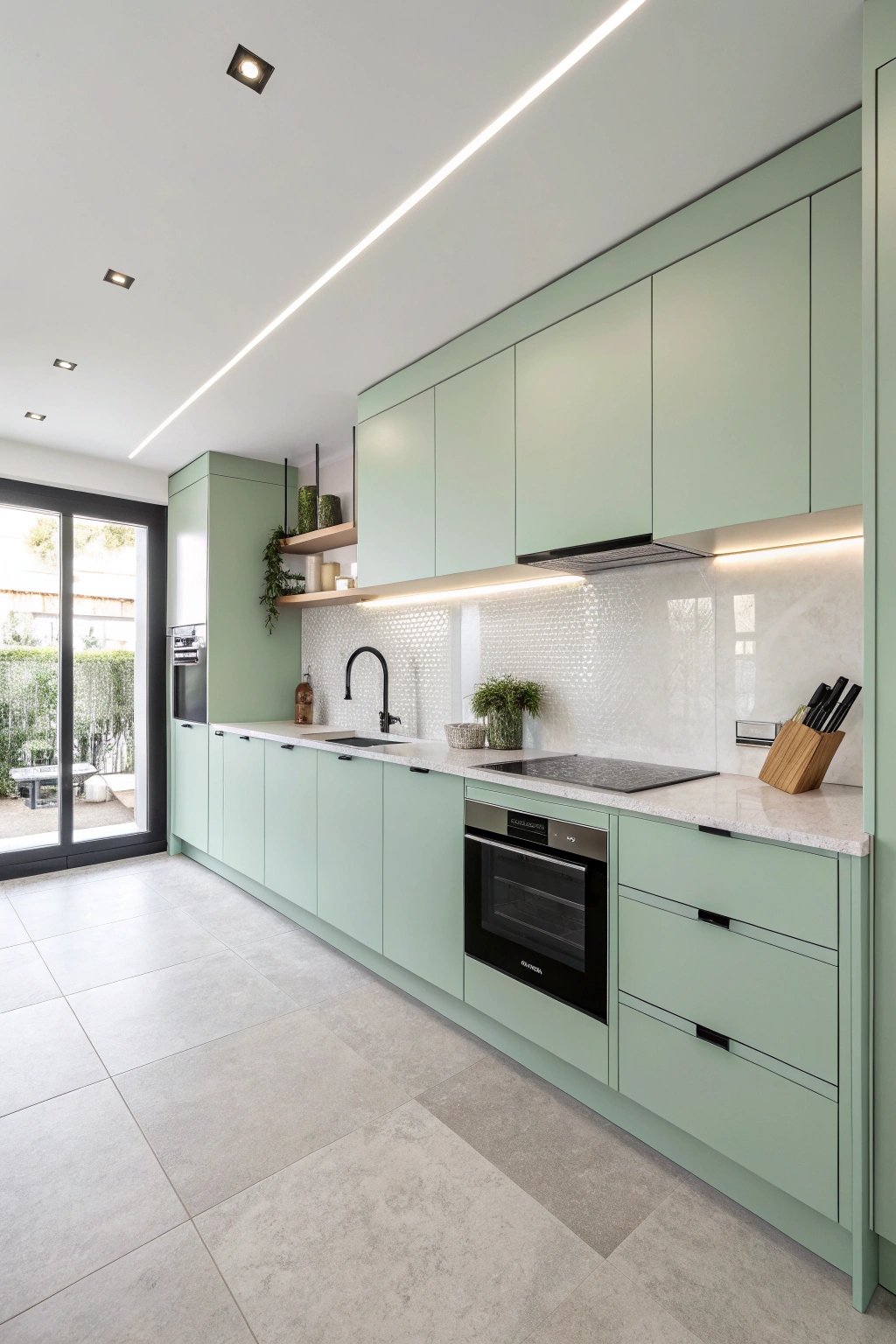 Mint reads fresh and contemporary on flat slab doors with integrated pulls. Pair with white quartz, a thin stainless worktop at the range, and a single open shelf for the essentials.