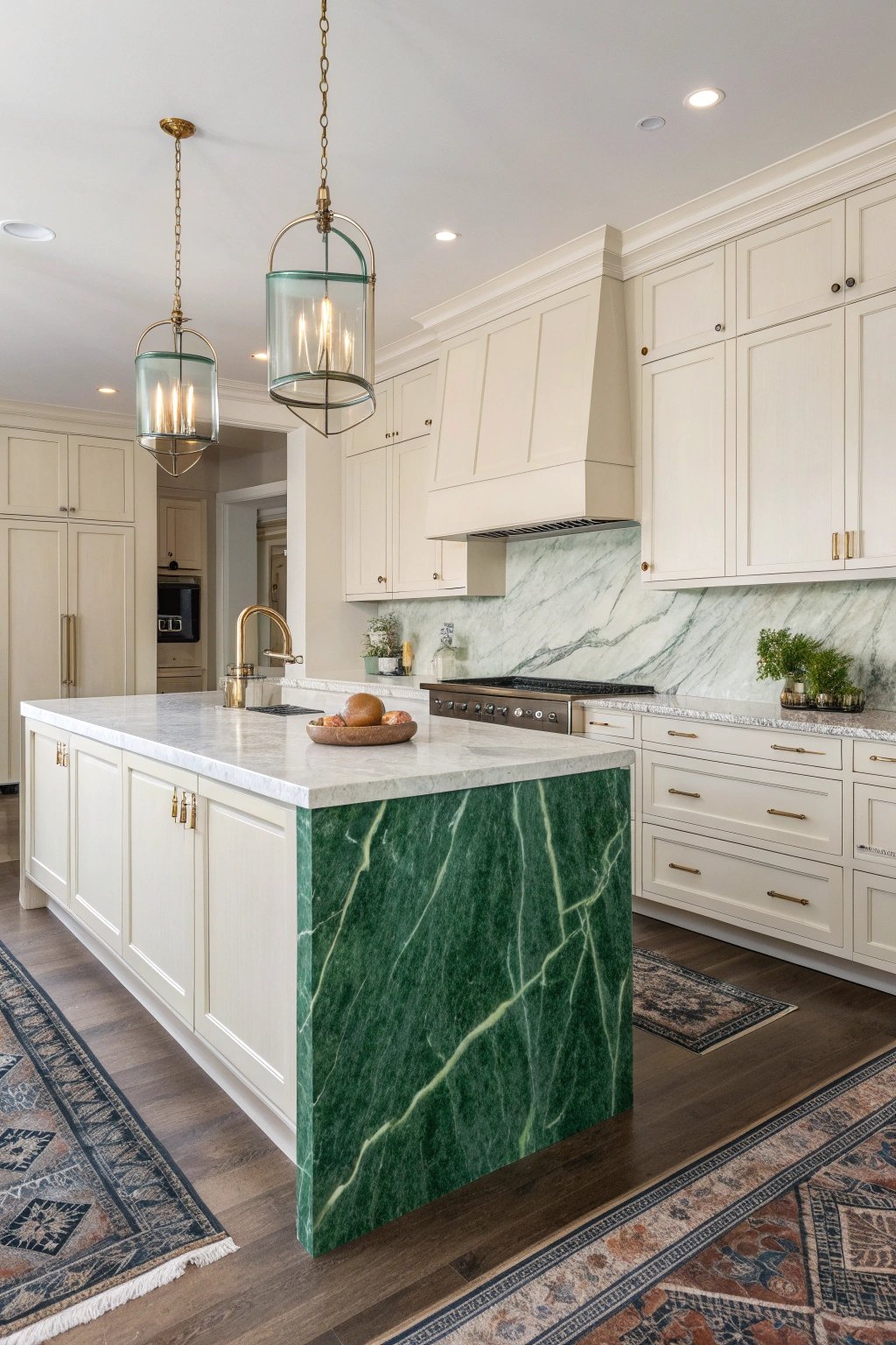 If you love drama, choose the stone as hero: a jade quartzite or green marble waterfall island under simple off-white cabinets. Keep hardware minimal and the backsplash quiet to let the veining shine.