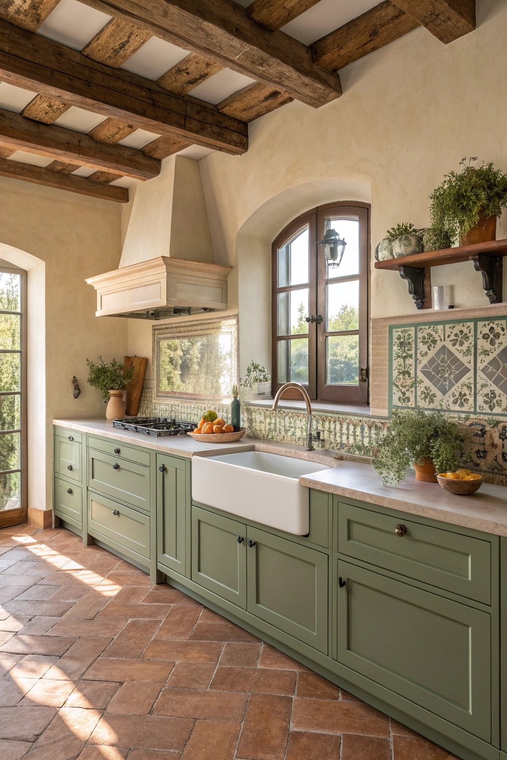 Olive green cabinets pair beautifully with terracotta floors and hand-painted tiles. A plastered hood with gentle curves softens lines, while open plate racks and rustic beams add countryside warmth.